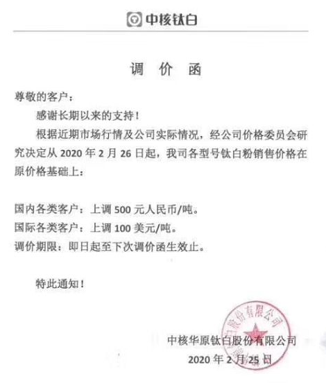 2020年2月25日,中核華原鈦白股份公司發(fā)布調(diào)價函通知,根據(jù)目前市場及實(shí)際情況,經(jīng)公司價格委員會研究決定從2020年2月26日起,調(diào)整公司各個型號鈦白粉市場價格。