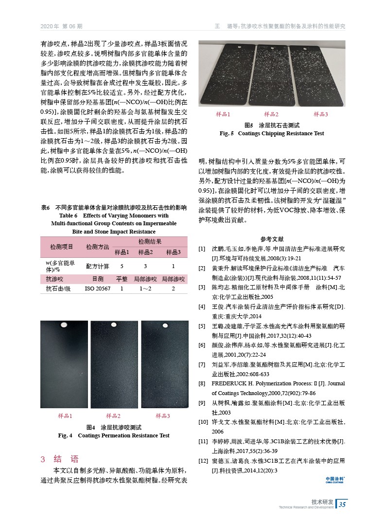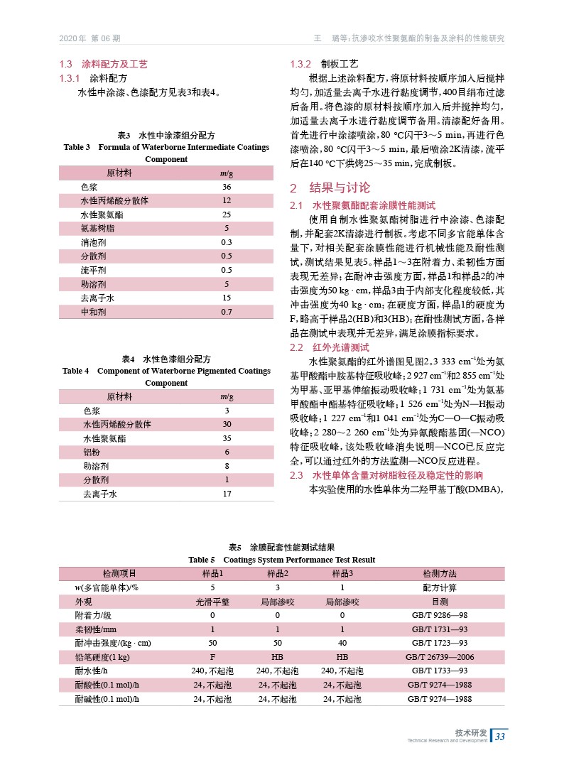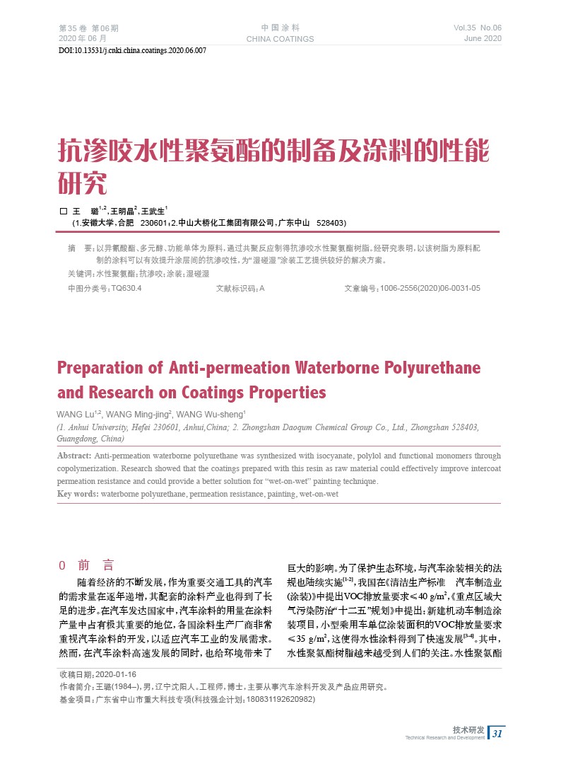摘要:以異氰酸酯、多元醇、功能單體為原料,通過共聚反應(yīng)制得抗?jié)B咬水性聚氨酯樹脂。經(jīng)研究表明,以該樹脂為原料配制的涂料可以有效提升涂層間的抗?jié)B咬性,為“濕碰濕”涂裝工藝提供較好的解決方案。