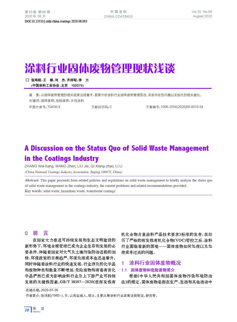 從固體廢物管理的相關政策法規著手,簡要分析涂料行業固體廢物管理現狀、目前存在的問題以及給出的相關建議。