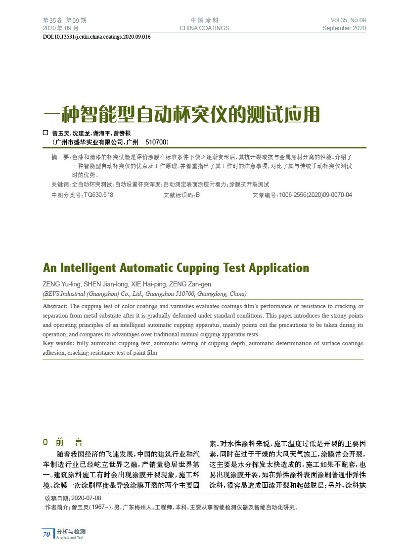 色漆和清漆的杯突試驗是評價涂膜在標準條件下使之逐漸變形后,其抗開裂或抗與金屬底材分離的性能。介紹了一種智能型自動杯突儀的優點及工作原理。并著重指出了其工作時的注意事項,對比了其與傳統手動杯突儀測試時的優勢。