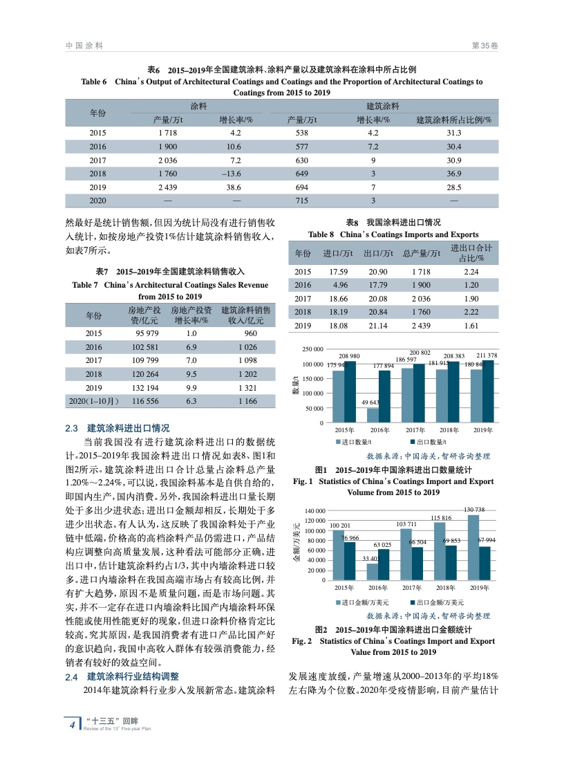 從建筑涂料的市場背景入手,從建筑涂料的產能、產量、進出口、結構調整、技術創新、環保等方面,對“十三五”期間中國建筑涂料工業作了概括性總結,指出了我國建筑涂料與世界的差距,并對“十四五”期間的我國建筑涂料工業發展進行了展望。