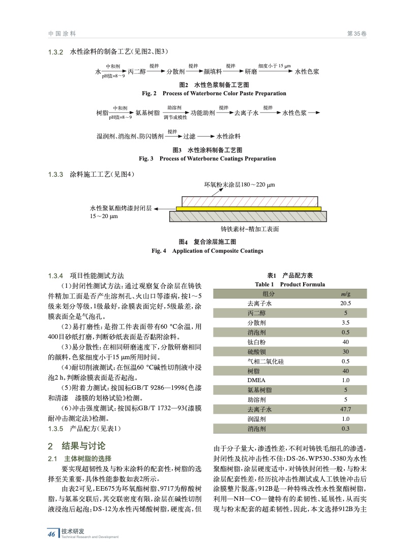 摘要:介紹了一種應(yīng)用于機(jī)電鑄鐵件的水性聚氨酯封閉烤漆,實(shí)現(xiàn)了與粉末涂料涂層的配套,重點(diǎn)闡述了該涂料的制備工藝,探討了各種樹(shù)脂與固化劑的搭配、功能助劑、助溶劑對(duì)涂膜性能及配套性的影響。通過(guò)電鏡分析對(duì)比,產(chǎn)品對(duì)鑄鐵毛細(xì)孔封閉性佳,有效解決了水性涂層與粉末涂層的厚涂涂裝爆泡難題及柔韌性問(wèn)題。