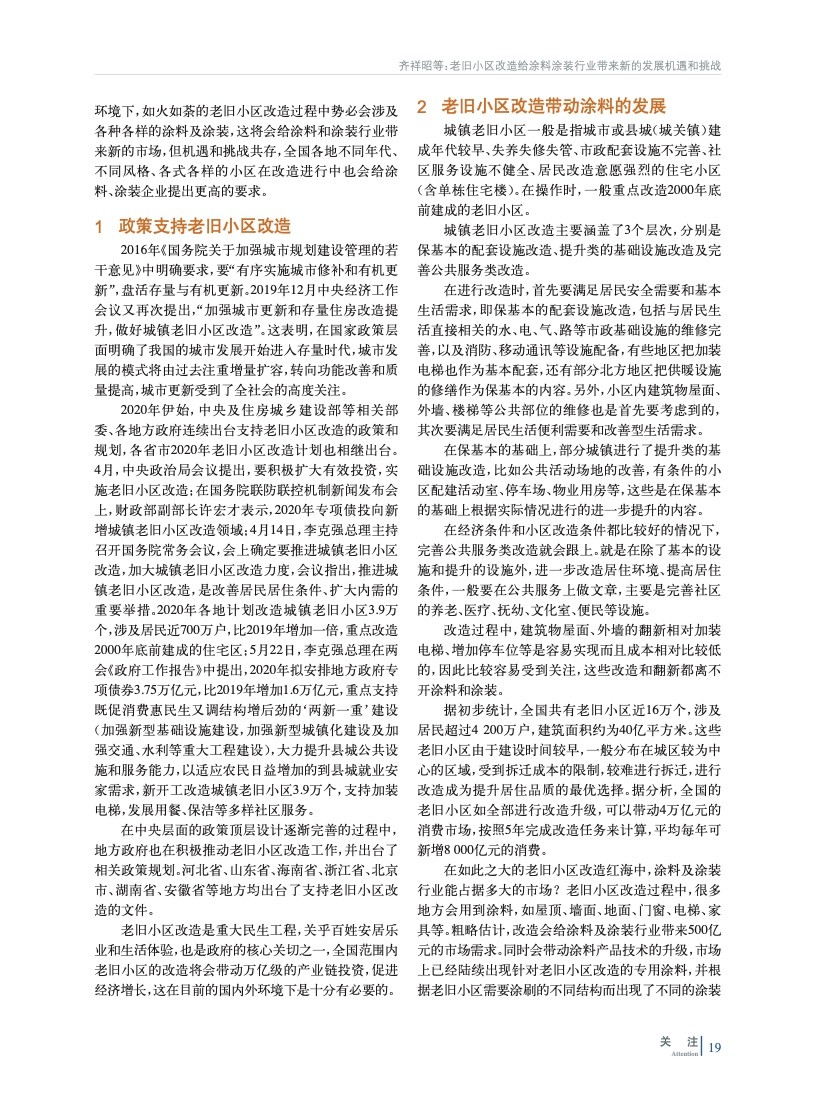 老舊小區改造為改善民生、提振國家經濟指明了新的方向,老舊小區改造會給涂料和涂裝行業帶來新的發展機遇,同時也有挑戰。