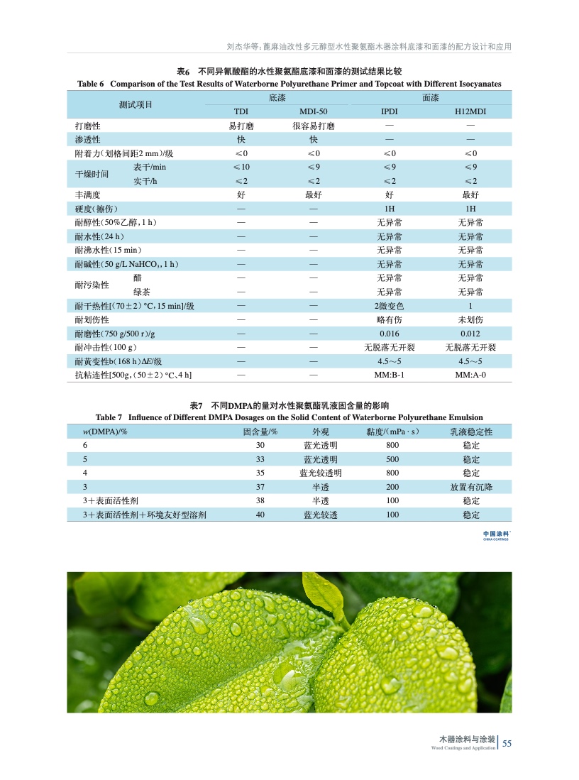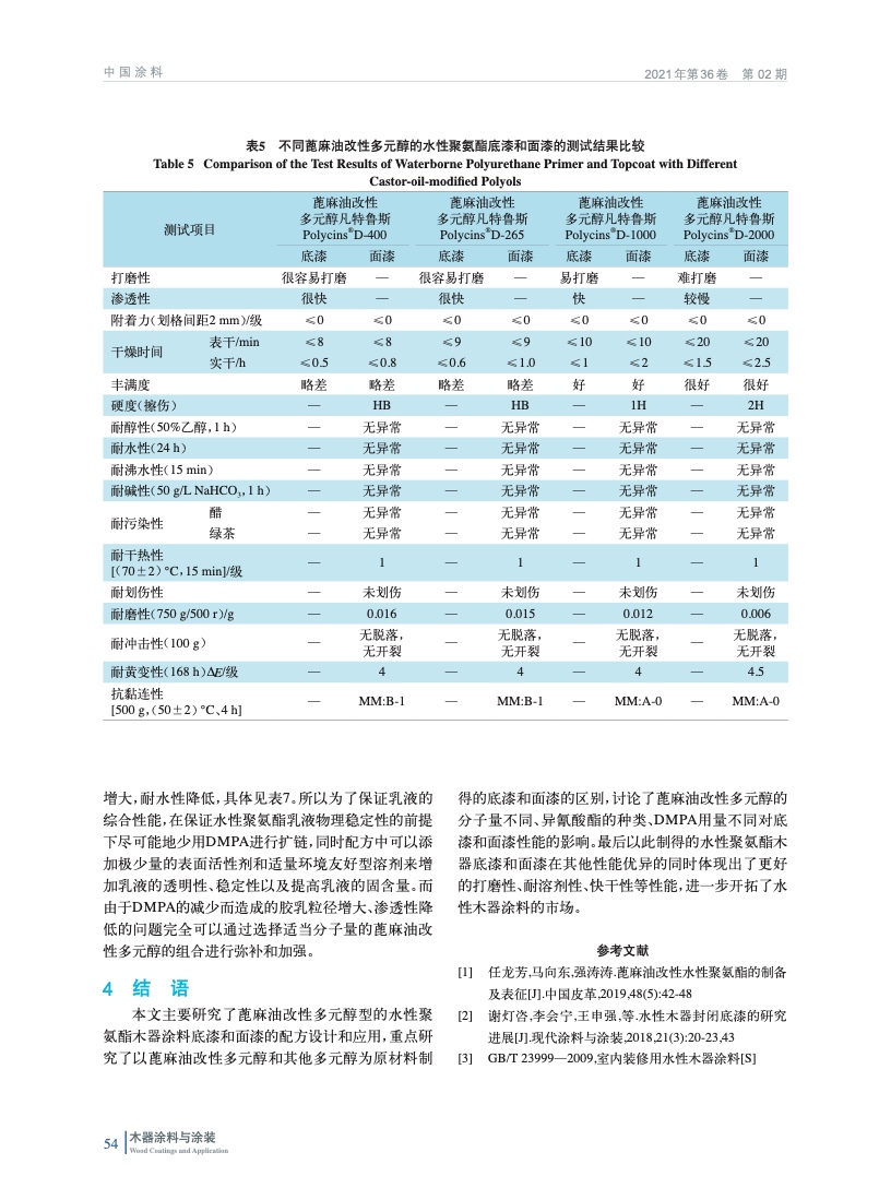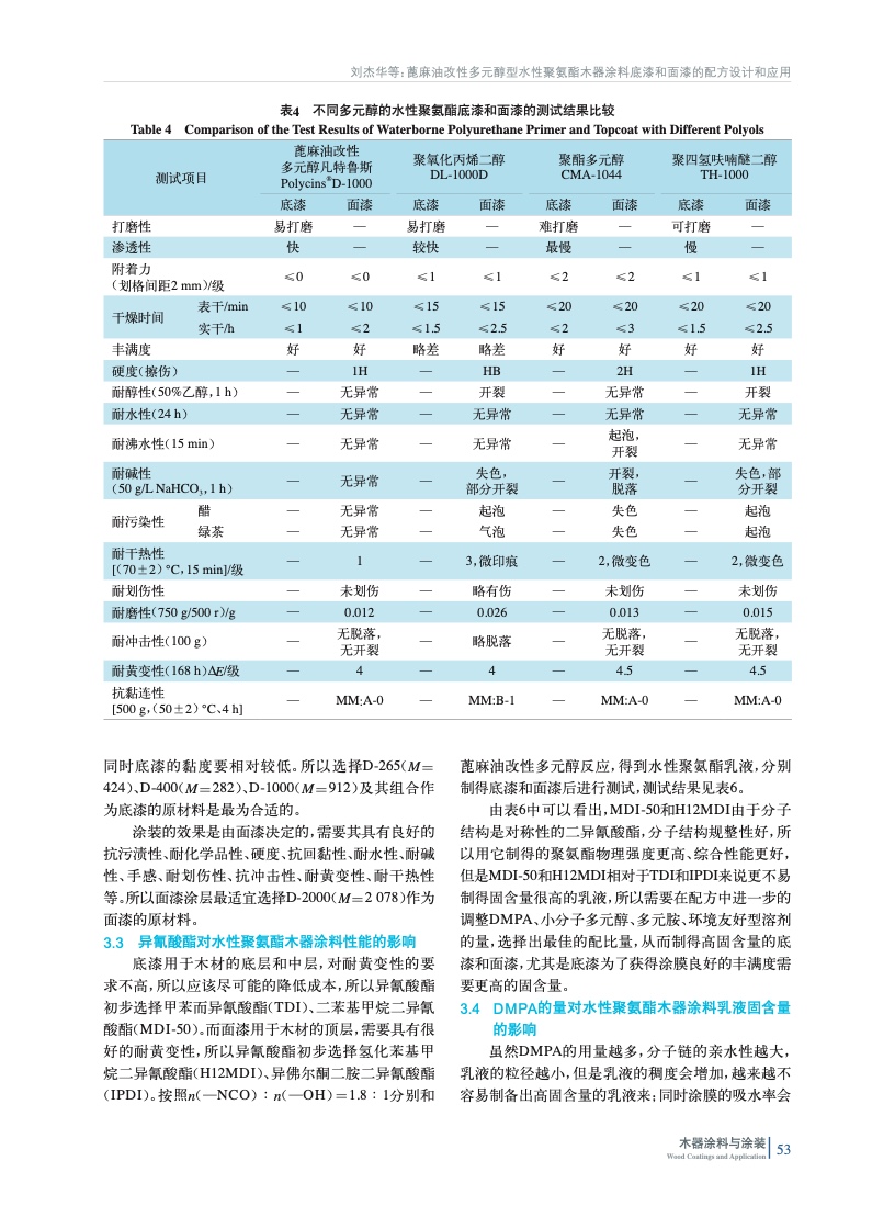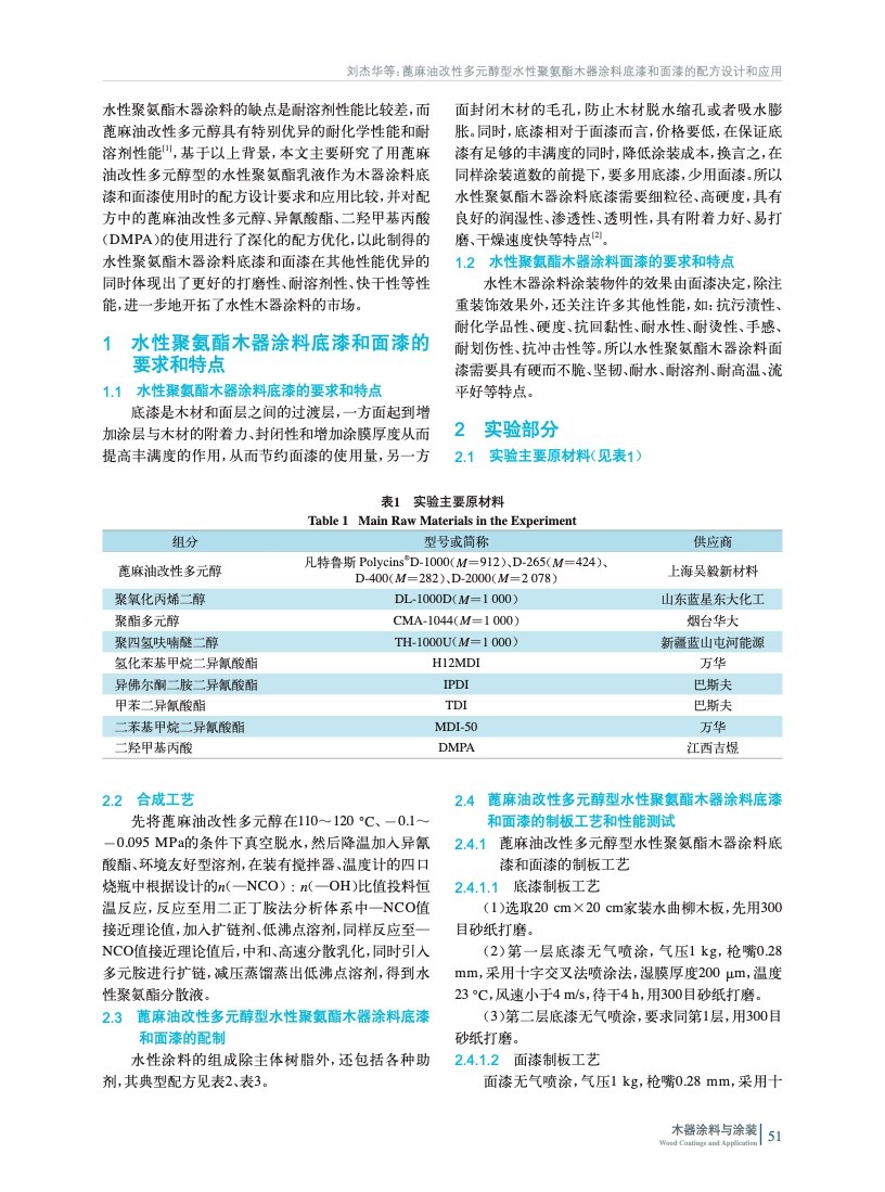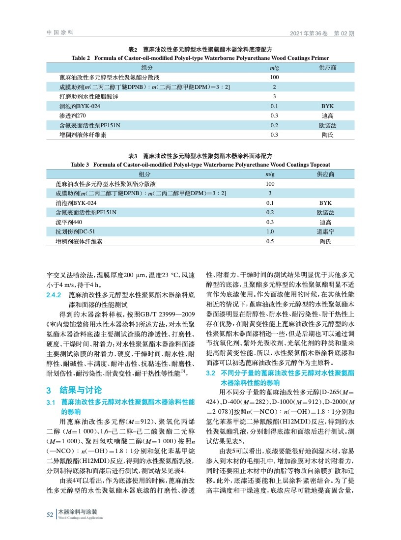 蓖麻油改性多元醇型水性聚氨酯木器涂料底漆和面漆的配方設計和應用