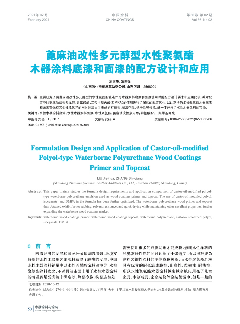 摘要:主要研究了用蓖麻油改性多元醇型的水性聚氨酯乳液作為木器涂料底漆和面漆使用時的配方設計要求和應用比較,并對配方中的蓖麻油改性多元醇、異氰酸酯、二羥甲基丙酸(DMPA)的使用進行了深化的配方優化,以此制得的水性聚氨酯木器底漆和面漆在保持其他性能優異的同時體現出了更好的打磨性、耐溶劑性、快干性等性能,進一步開拓了水性木器涂料的市場。