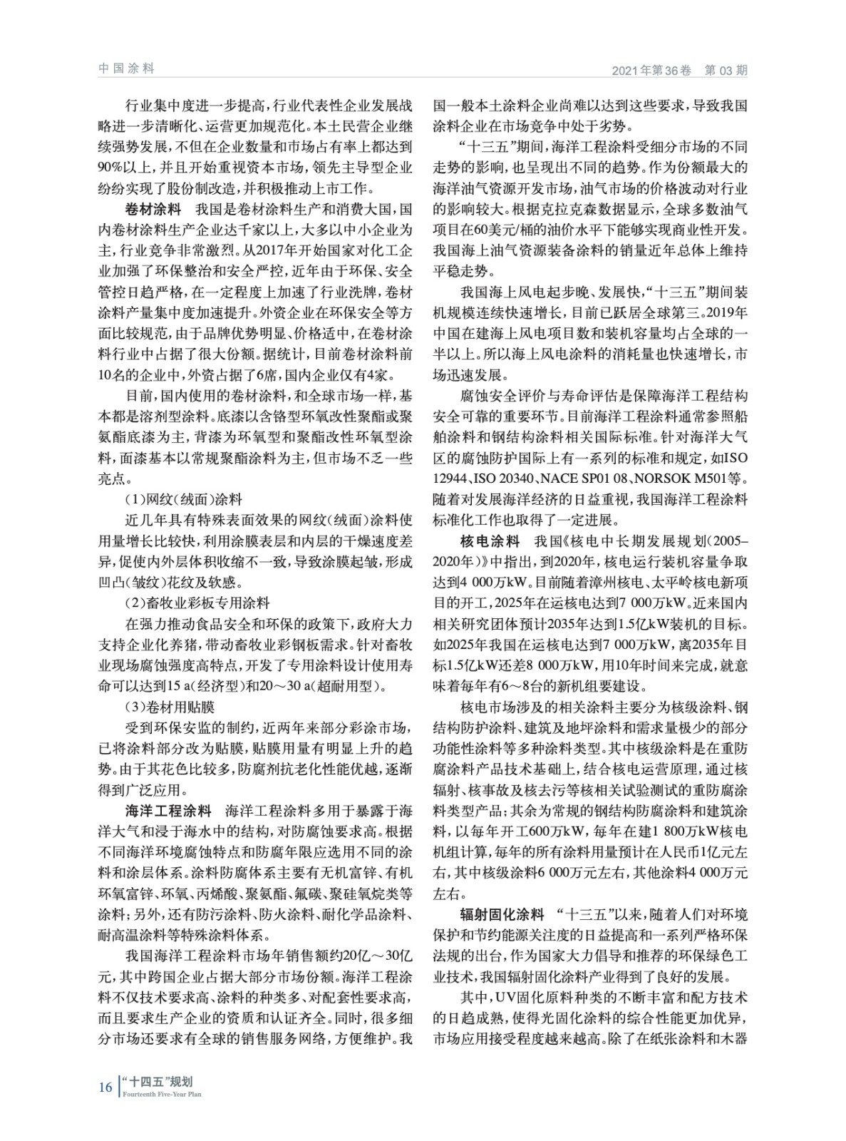 摘要:編者按:2021年3月24日,《中國涂料行業(yè)“十四五”規(guī)劃》于“2021中國國際涂料大會”期間正式發(fā)布,為中國涂料行業(yè)未來5年的發(fā)展擘畫了目標和方向。為了使涂料行業(yè)及相關(guān)領(lǐng)域及時深入了解《中國涂料行業(yè)“十四五”規(guī)劃》的精髓和全貌,本刊將從本期開始全文刊登,并分別解讀重點領(lǐng)域的“十四五”發(fā)展規(guī)劃,以饗讀者。