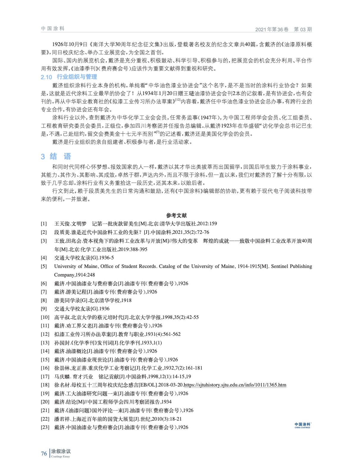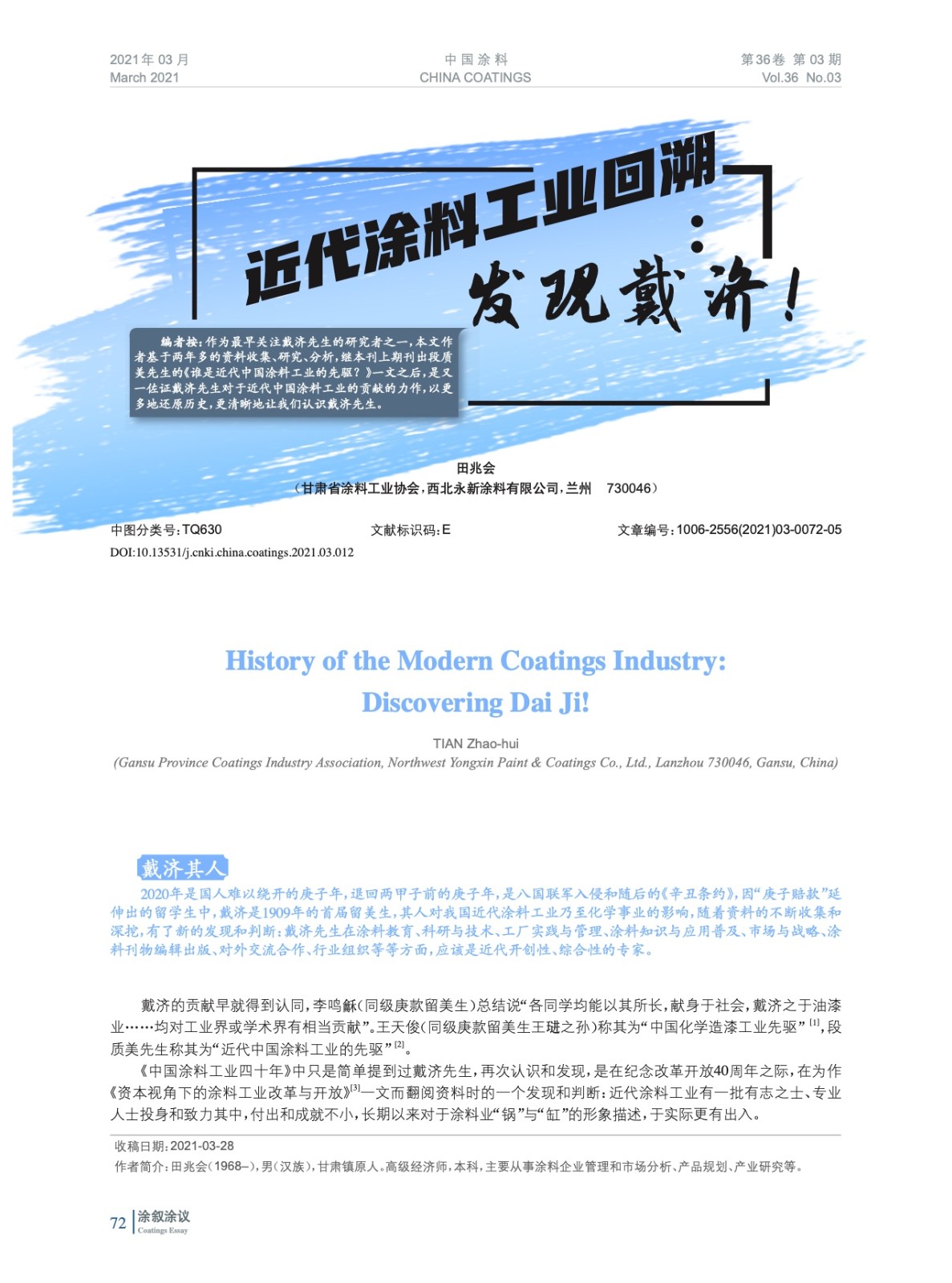 摘要:編者按:作為最早關(guān)注戴濟先生的研究者之一,本文作者基于兩年多的資料收集、研究、分析,繼本刊上期刊出段質(zhì)美先生的《誰是近代中國涂料工業(yè)的先驅(qū)?》一文之后,是又一佐證戴濟先生對于近代中國涂料工業(yè)的貢獻的力作,以更多地還原歷史,更清晰地讓我們認(rèn)識戴濟先生。