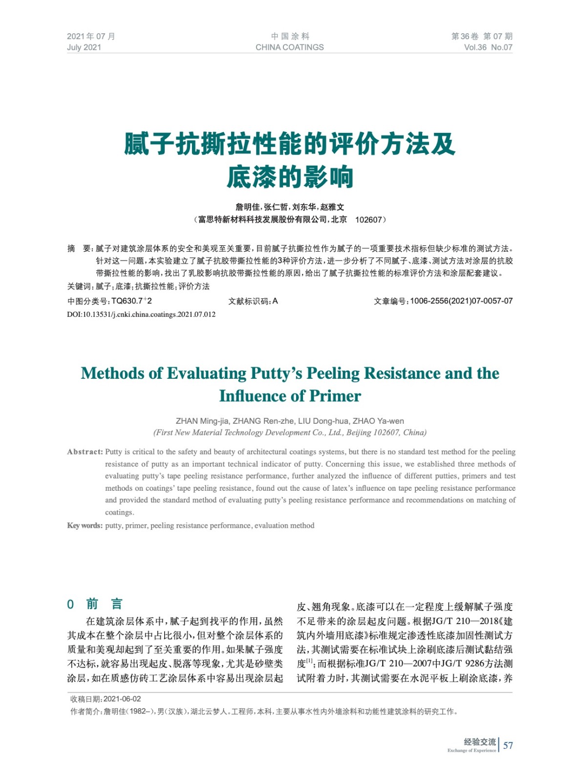 摘要:膩?zhàn)訉?duì)建筑涂層體系的安全和美觀至關(guān)重要,目前膩?zhàn)涌顾豪宰鳛槟佔(zhàn)拥囊豁?xiàng)重要技術(shù)指標(biāo)但缺少標(biāo)準(zhǔn)的測(cè)試方法。針對(duì)這一問(wèn)題,本實(shí)驗(yàn)建立了膩?zhàn)涌鼓z帶撕拉性能的3種評(píng)價(jià)方法,進(jìn)一步分析了不同膩?zhàn)印⒌灼帷y(cè)試方法對(duì)涂層的抗膠帶撕拉性能的影響,找出了乳膠影響抗膠帶撕拉性能的原因,給出了膩?zhàn)涌顾豪阅艿臉?biāo)準(zhǔn)評(píng)價(jià)方法和涂層配套建議。
