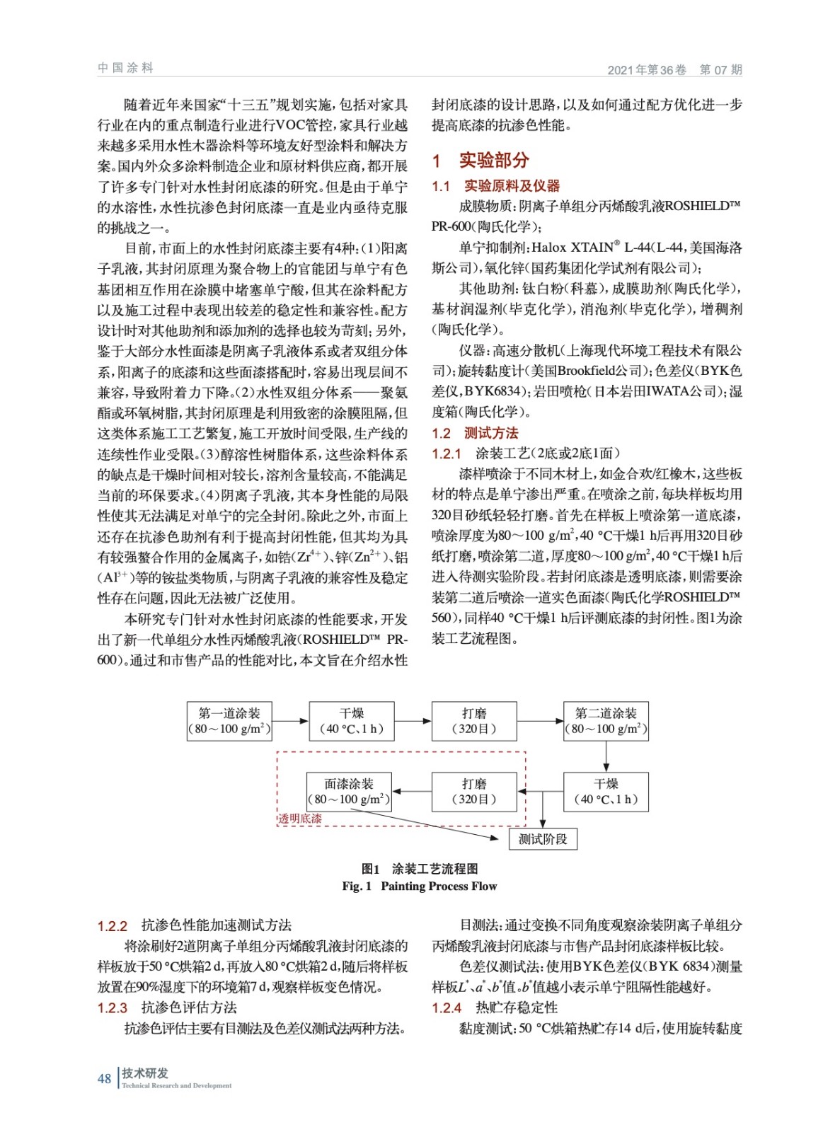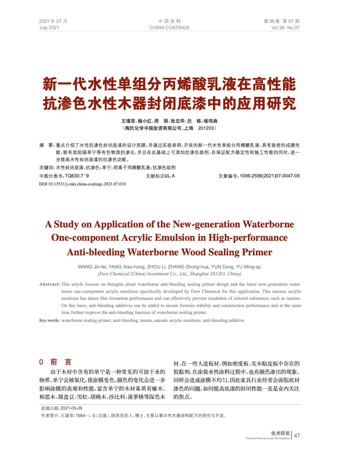 新一代水性單組分丙烯酸乳液在高性能抗滲色水性木器封閉底漆中的應用研究