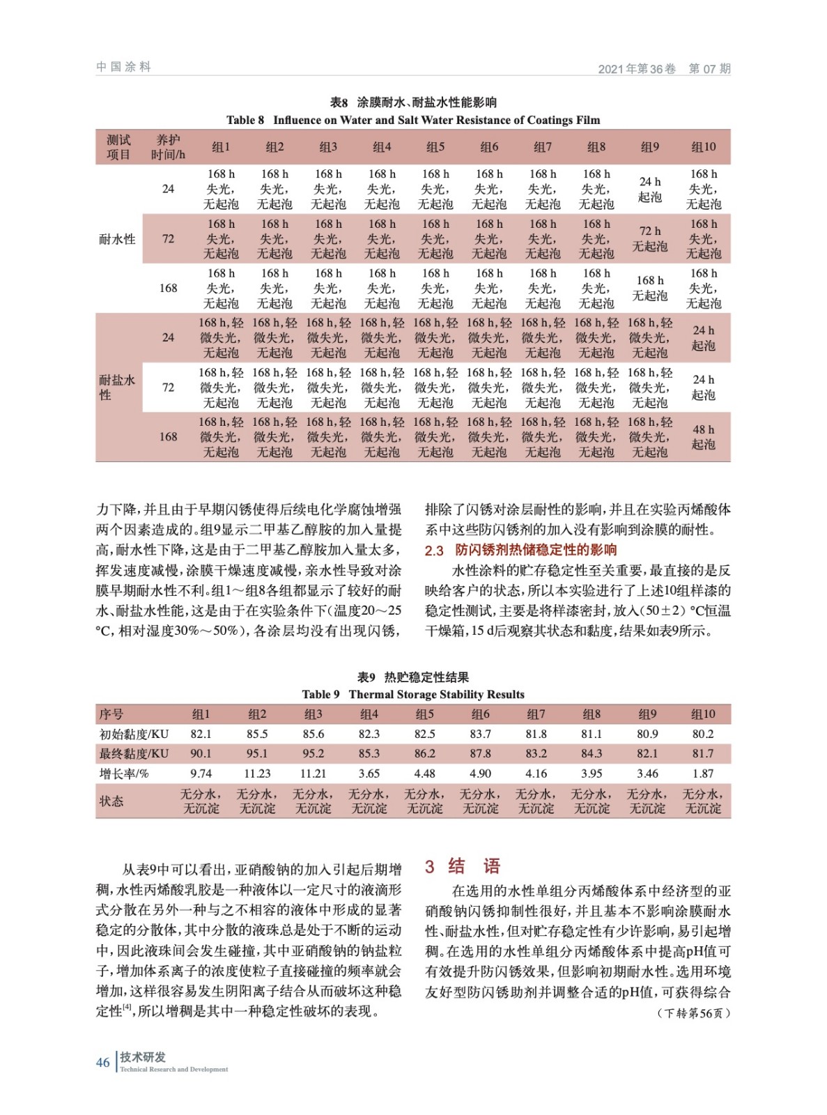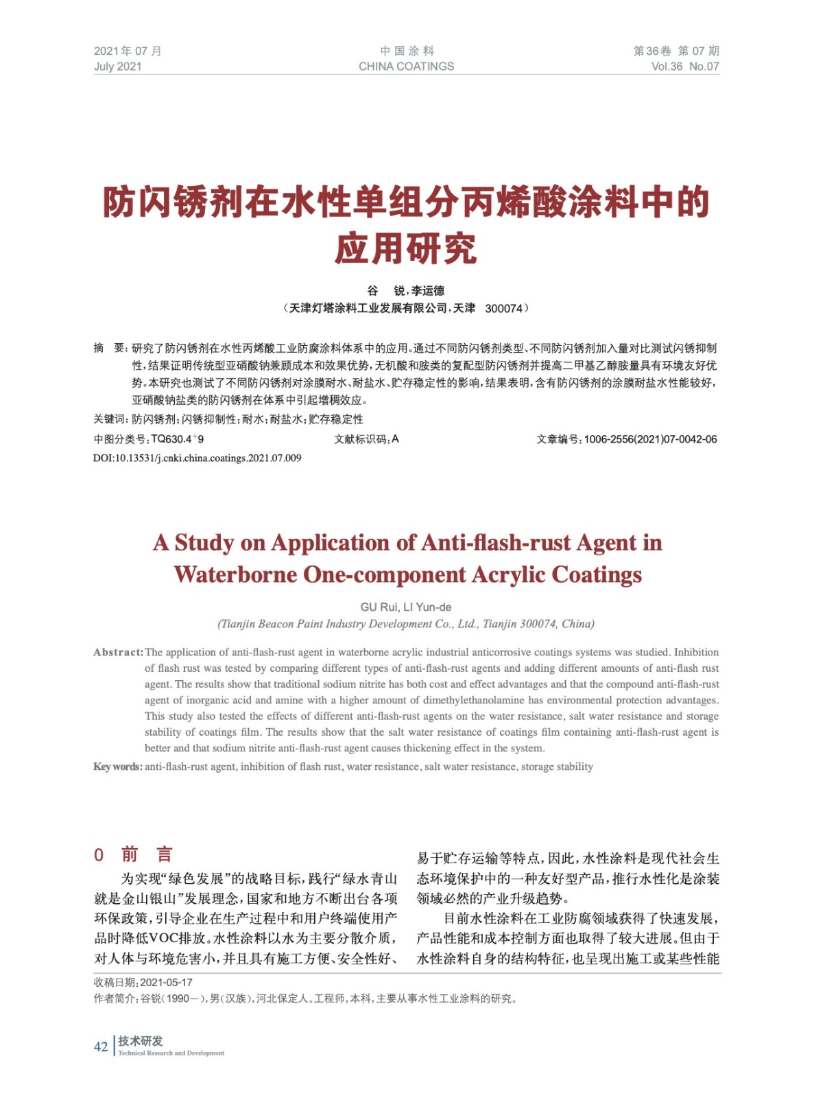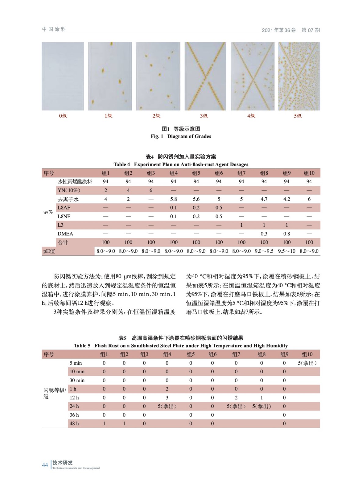 防閃銹劑在水性單組分丙烯酸涂料中的應用研究