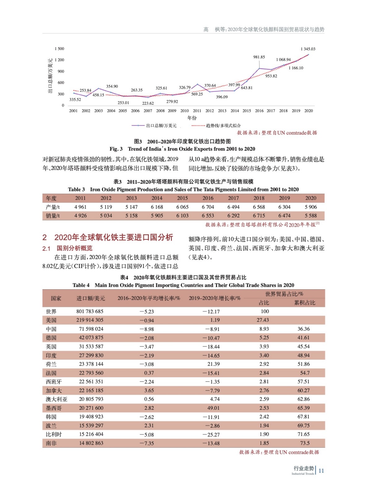 基于聯合國商品貿易統計數據庫(UNCTADstat)與美國地質勘探局站(USGS)等公開數據資源,詳細分析了2020年前后全球氧化鐵顏料貿易的最新現狀與趨勢。尤其就中國主要出口競爭國德國、潛在出口競爭國印度,以及主要出口目的國美國的發展趨勢與波動進行重點剖析與比較。