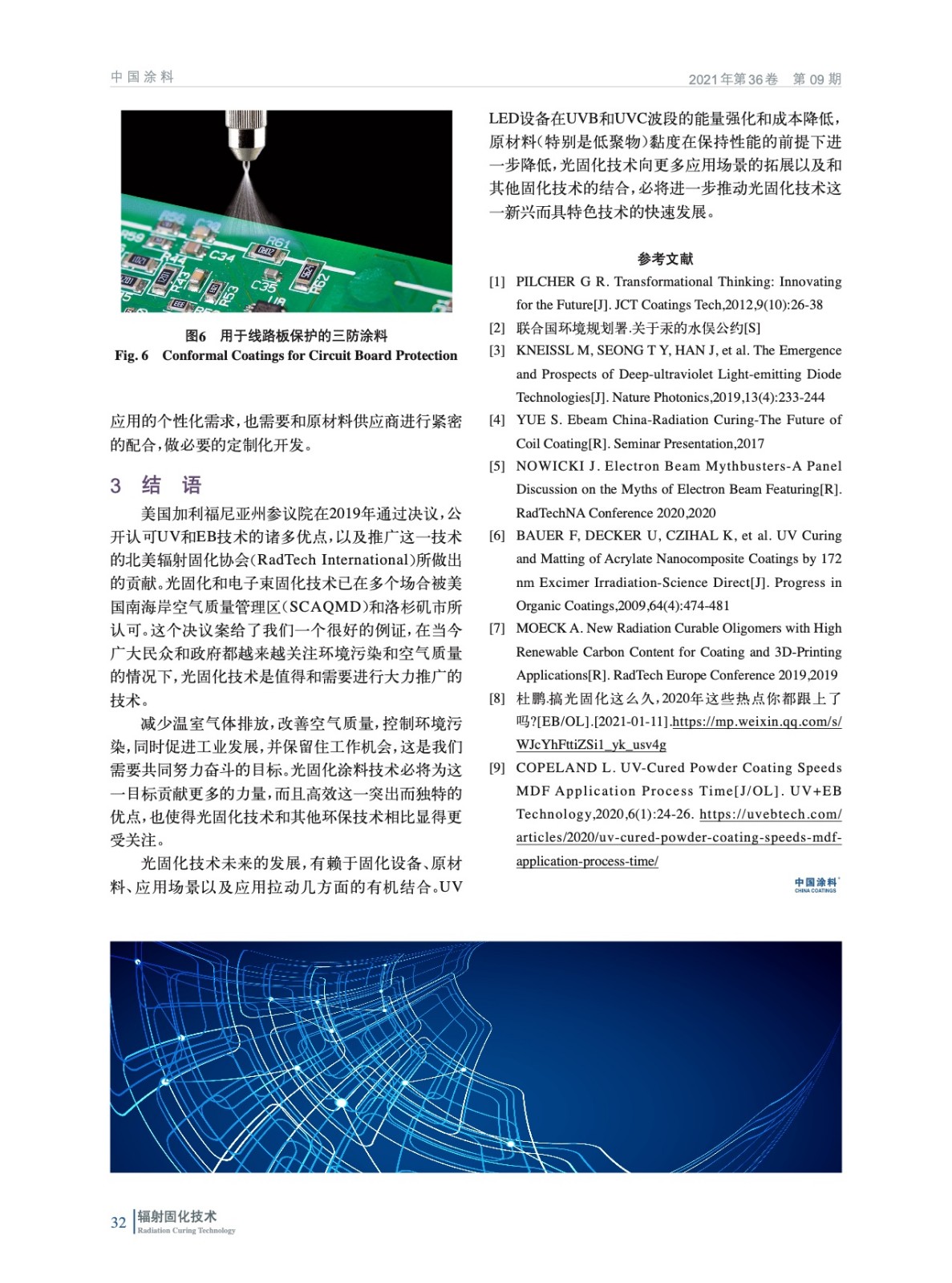 摘要:簡(jiǎn)單回顧了光固化技術(shù)作為一種綠色環(huán)保、高效技術(shù),其在過去的幾十年中的發(fā)展歷程。并介紹了固化設(shè)備,指出固化設(shè)備方面的UV LED、電子束固化、準(zhǔn)分子固化拓寬了應(yīng)用場(chǎng)景,高固低黏、亞光,以及在膜方面的應(yīng)用等為光固化帶來了新的發(fā)展機(jī)會(huì),和水性、粉末以及濕氣固化相結(jié)合的配合使用,可以對(duì)不同的固化技術(shù)揚(yáng)長避短。分析和展望了光固化技術(shù)向更多應(yīng)用場(chǎng)景的拓展以及和其他固化技術(shù)的結(jié)合,進(jìn)一步推動(dòng)光固化技術(shù)快速發(fā)展。