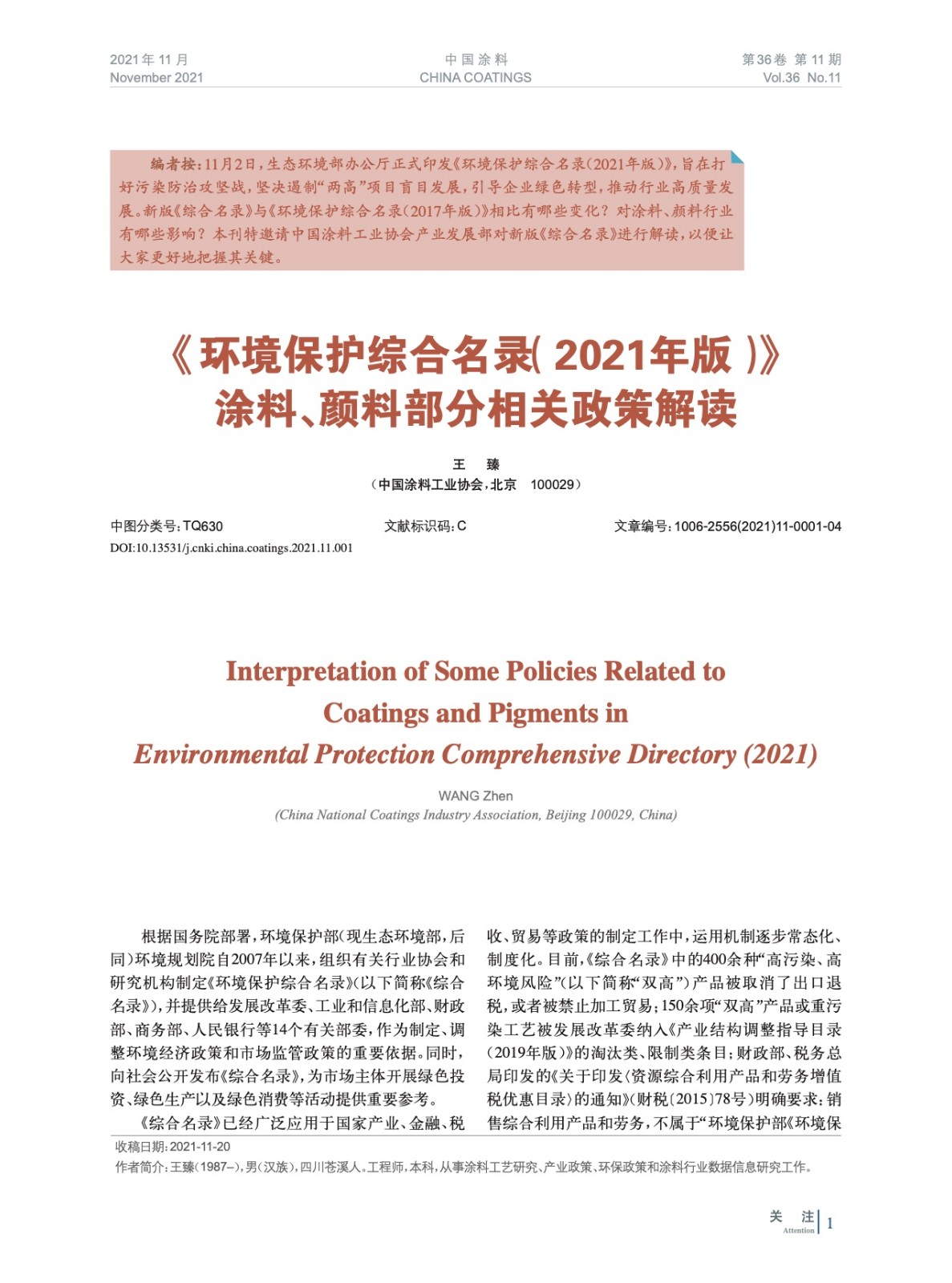 摘要:編者按:11月2日,生態環境部辦公廳正式印發《環境保護綜合名錄(2021年版)》,旨在打好污染防治攻堅戰,堅決遏制“兩高”項目盲目發展,引導企業綠色轉型,推動行業高質量發展。新版《綜合名錄》與《環境保護綜合名錄(2017年版)》相比有哪些變化?對涂料、顏料行業有哪些影響?本刊特邀請中國涂料工業協會產業發展部對新版《綜合名錄》進行解讀,以便讓大家更好地把握其關鍵。