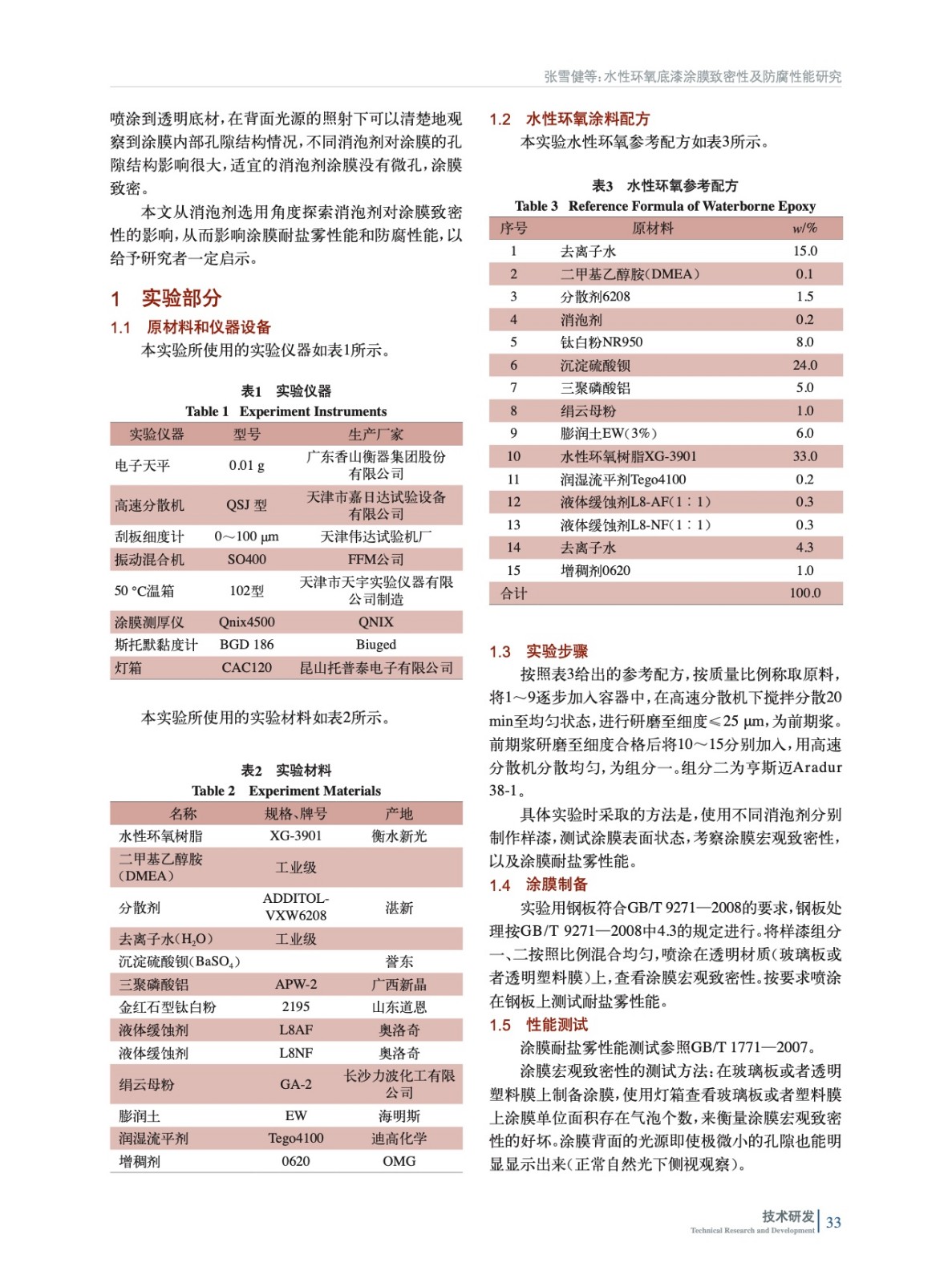 研究了不同消泡劑對水性環氧底漆涂膜致密性的影響,以及涂膜致密性對涂料防腐性能的影響。