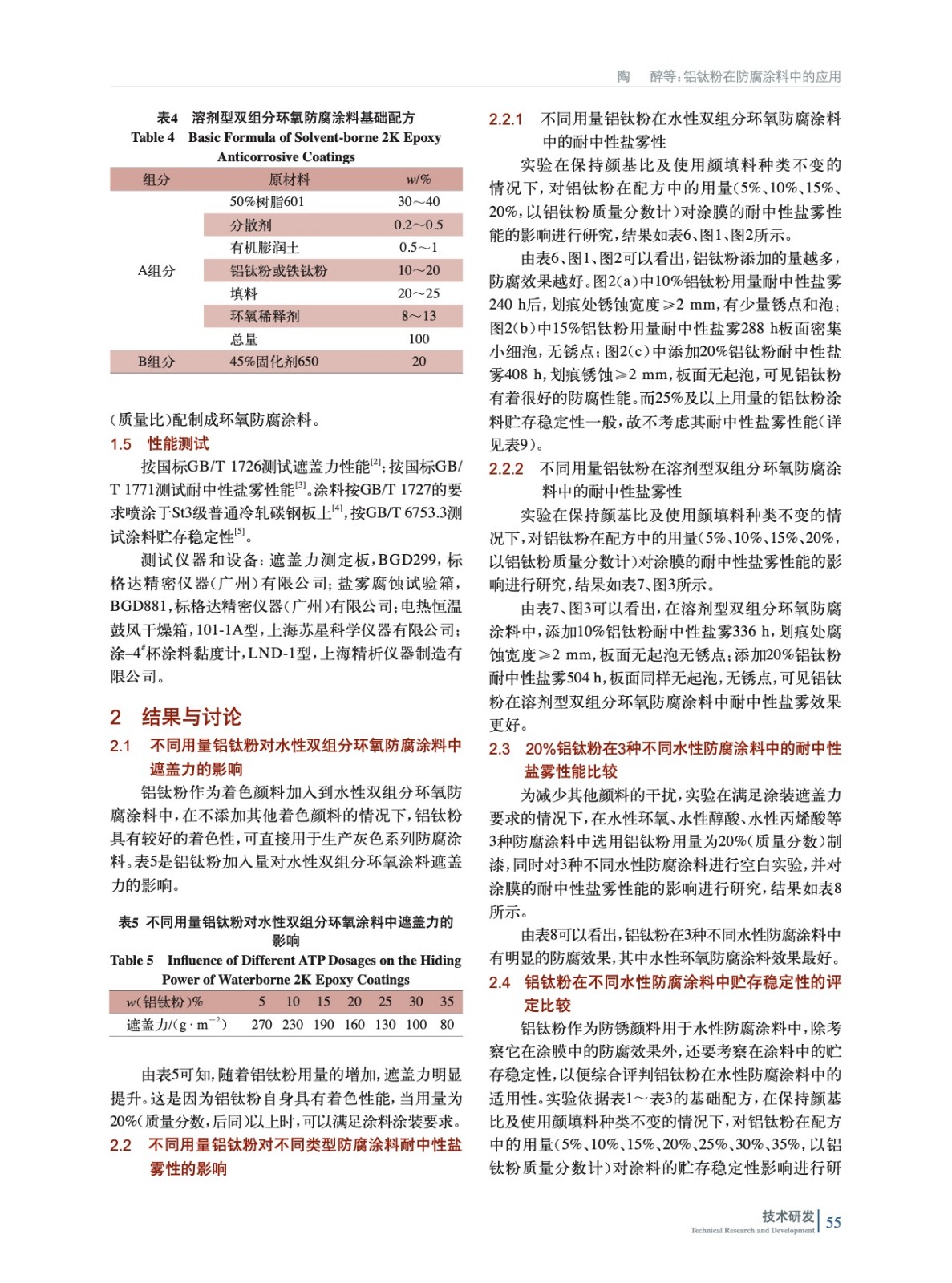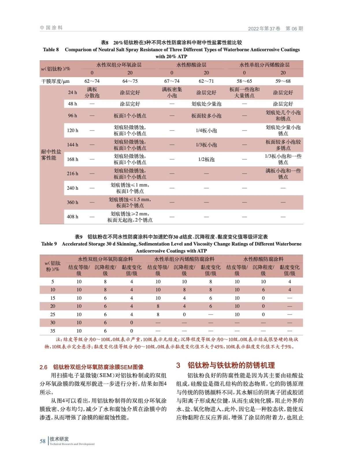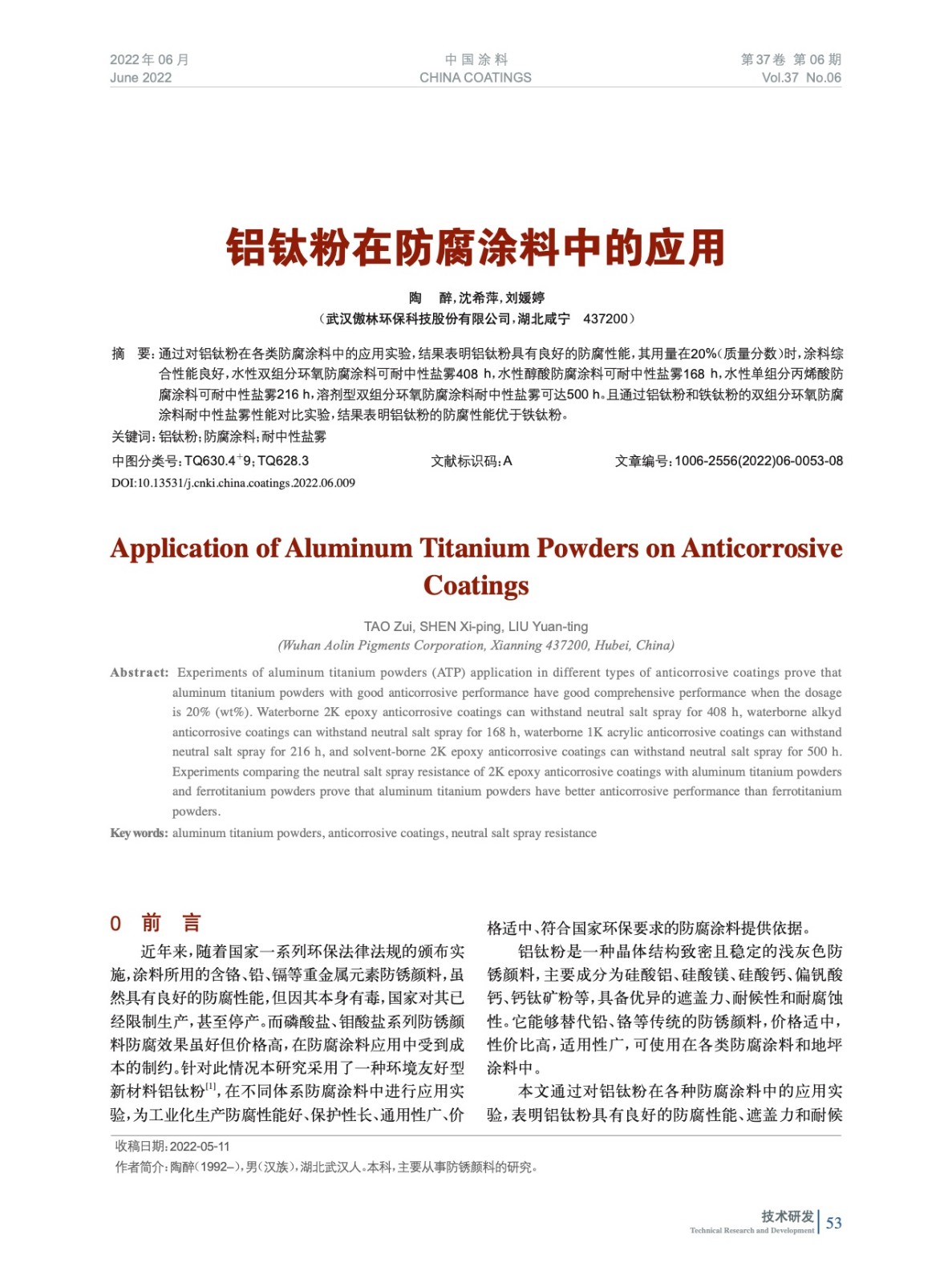 摘要:通過對鋁鈦粉在各類防腐涂料中的應用實驗,結果表明鋁鈦粉具有良好的防腐性能,其用量在20%時,涂料綜合性能良好,水性雙組分環氧防腐涂料可耐中性鹽霧408 h,水性醇酸防腐涂料可耐中性鹽霧168 h,水性單組分丙烯酸防腐涂料中達216 h,溶劑型雙組分環氧防腐涂料中達500 h。且通過鋁鈦粉和鐵鈦粉的雙組分環氧防腐涂料耐中性鹽霧性能對比實驗,結果表明鋁鈦粉的防腐性更優。