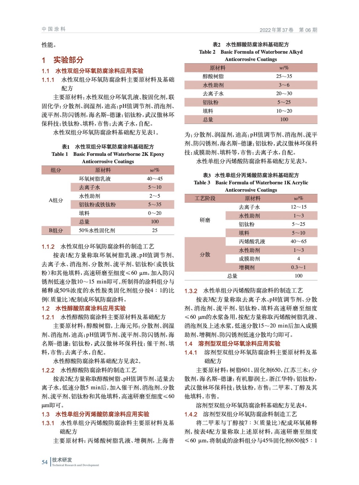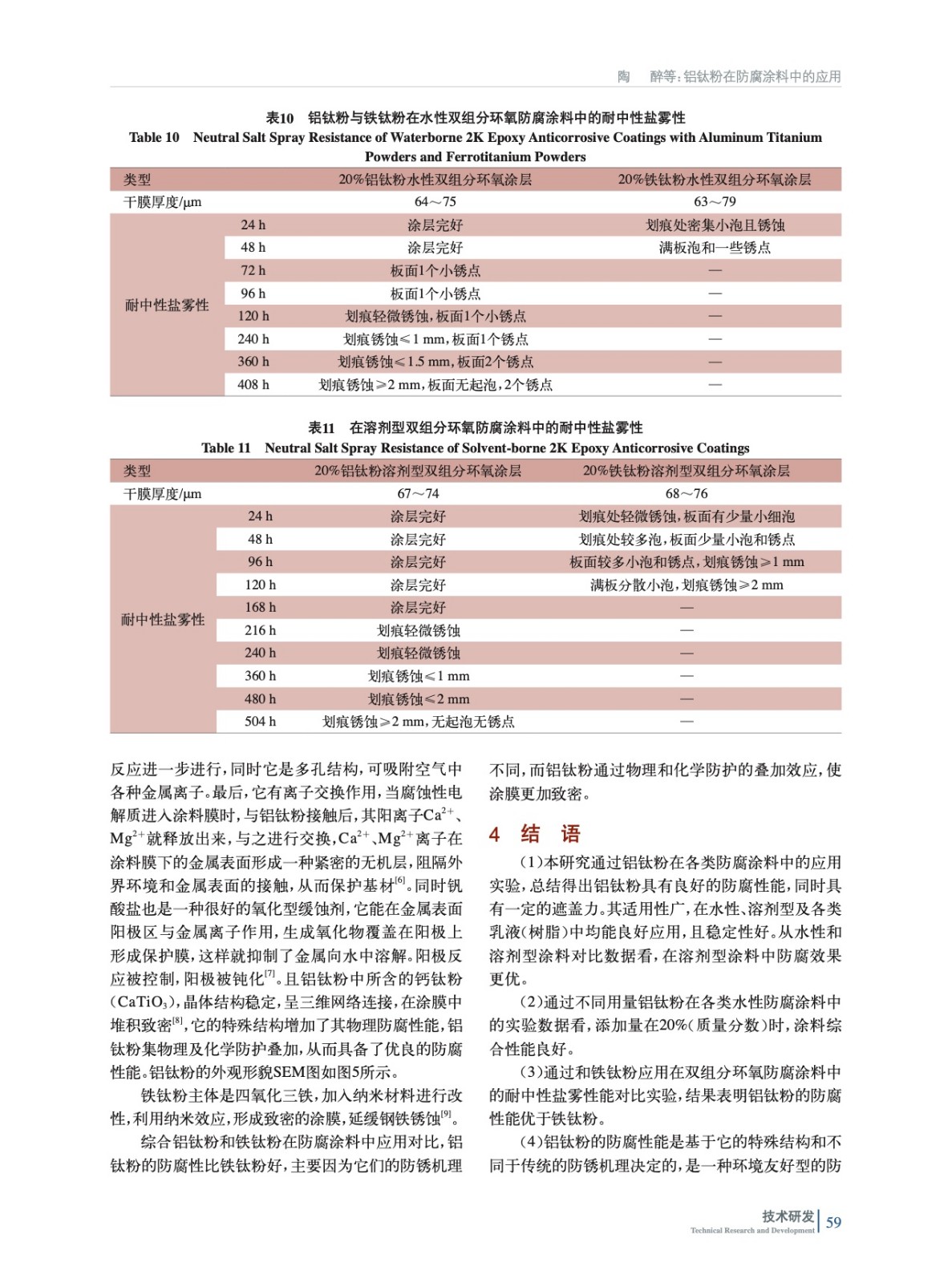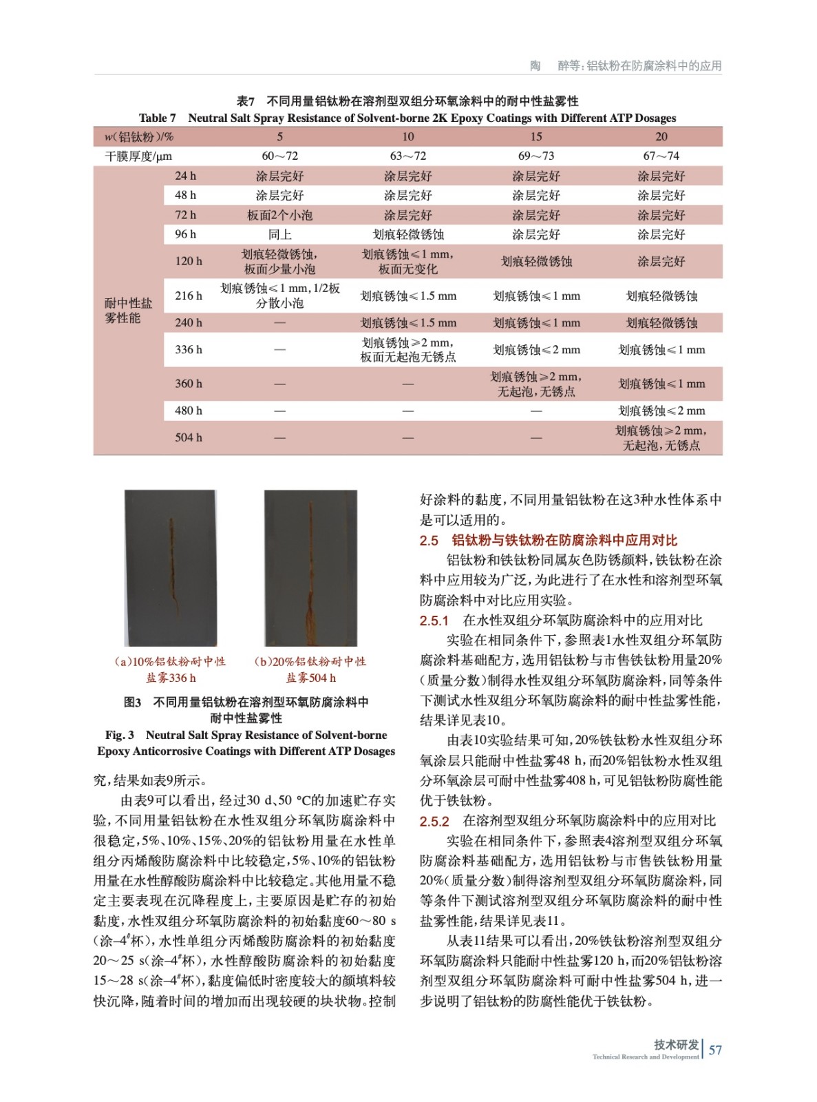 摘要:通過對鋁鈦粉在各類防腐涂料中的應用實驗,結果表明鋁鈦粉具有良好的防腐性能,其用量在20%時,涂料綜合性能良好,水性雙組分環氧防腐涂料可耐中性鹽霧408 h,水性醇酸防腐涂料可耐中性鹽霧168 h,水性單組分丙烯酸防腐涂料中達216 h,溶劑型雙組分環氧防腐涂料中達500 h。且通過鋁鈦粉和鐵鈦粉的雙組分環氧防腐涂料耐中性鹽霧性能對比實驗,結果表明鋁鈦粉的防腐性更優。