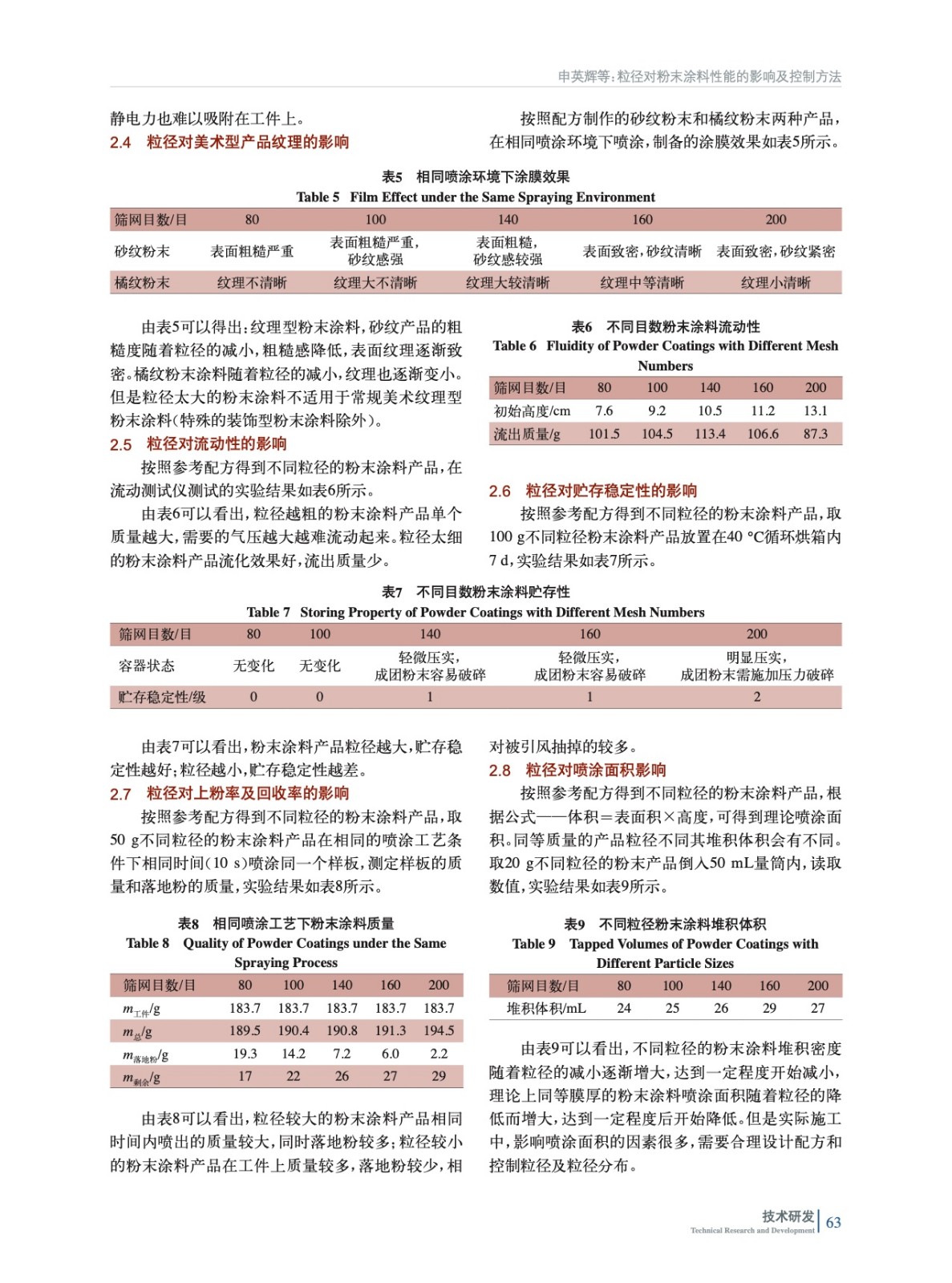 分析了粒徑對涂膜外觀及涂裝工藝的影響因素,如光澤度、流平性、涂膜厚度、紋理型表面效果以及粉體流動性、貯存穩定性、上粉率和噴涂面積等,針對不同的需求給出了粉末涂料粒徑及分布的控制方法。