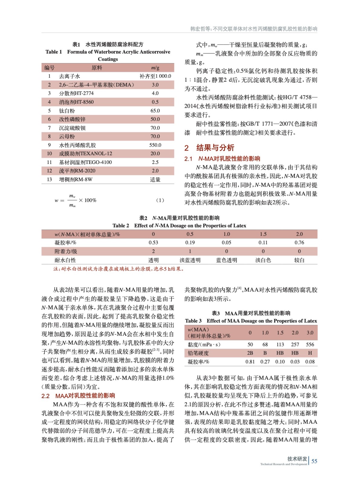 摘要:研究了N–羥甲基丙烯酰胺、甲基丙烯酸、硅烷偶聯(lián)劑以及磷酸酯功能單體4種不同交聯(lián)單體對(duì)丙烯酸乳膠的性能影響。數(shù)據(jù)表明,適量加入N-MA會(huì)提高乳膠的穩(wěn)定性,過多加入則會(huì)導(dǎo)致乳膠凝膠量增多,同時(shí)引起乳膠膜耐水性下降;MAA質(zhì)量分?jǐn)?shù)為2.0%時(shí),對(duì)提高聚合物交聯(lián)密度和涂膜硬度有作用;硅烷偶聯(lián)劑質(zhì)量分?jǐn)?shù)為0.3%時(shí),且采用后加入方式有利于提高乳膠穩(wěn)定性;磷酸酯功能單體對(duì)改善涂膜耐鹽霧性能效果顯著。