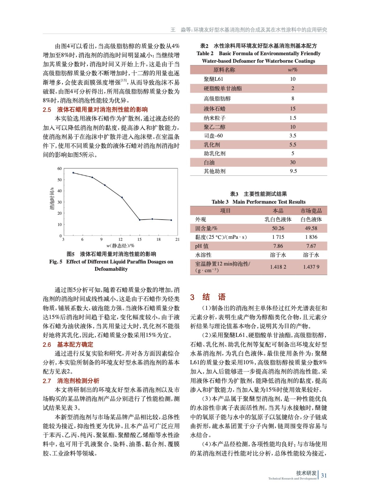 摘要:采用直接酯化法合成消泡劑主單體,通過紅外光譜分析產物的特征峰和元素分析,再對合成的主單體進行復配制備出水性涂料用水基消泡劑,對聚醚、高級脂肪醇、液體石蠟的用量等影響消泡劑性能的因素進行分析研究,確定出最佳合成工藝條件。結果表明,使用聚醚、硬脂酸單甘油酯、高級脂肪醇、液體石蠟、納米粒子、乳化劑、助乳化劑等原料可制備出性能優良的環境友好型水基涂料消泡劑;最佳使用量為:聚醚和高級脂肪醇分別采用10%和8%的質量分數加入;采用液體石蠟作為擴散劑,可降低消泡劑的黏度,提高滲入和擴散能力,加入質量分數為15%。該消泡劑可在45 ℃條件下實現25 d不分層,5 ℃下35 d不分層,室溫下100 d不分層,具有較好的穩定性和消泡性,與市售產品對比,總體性能較為接近,抑泡性更為優異,市場前景廣闊。