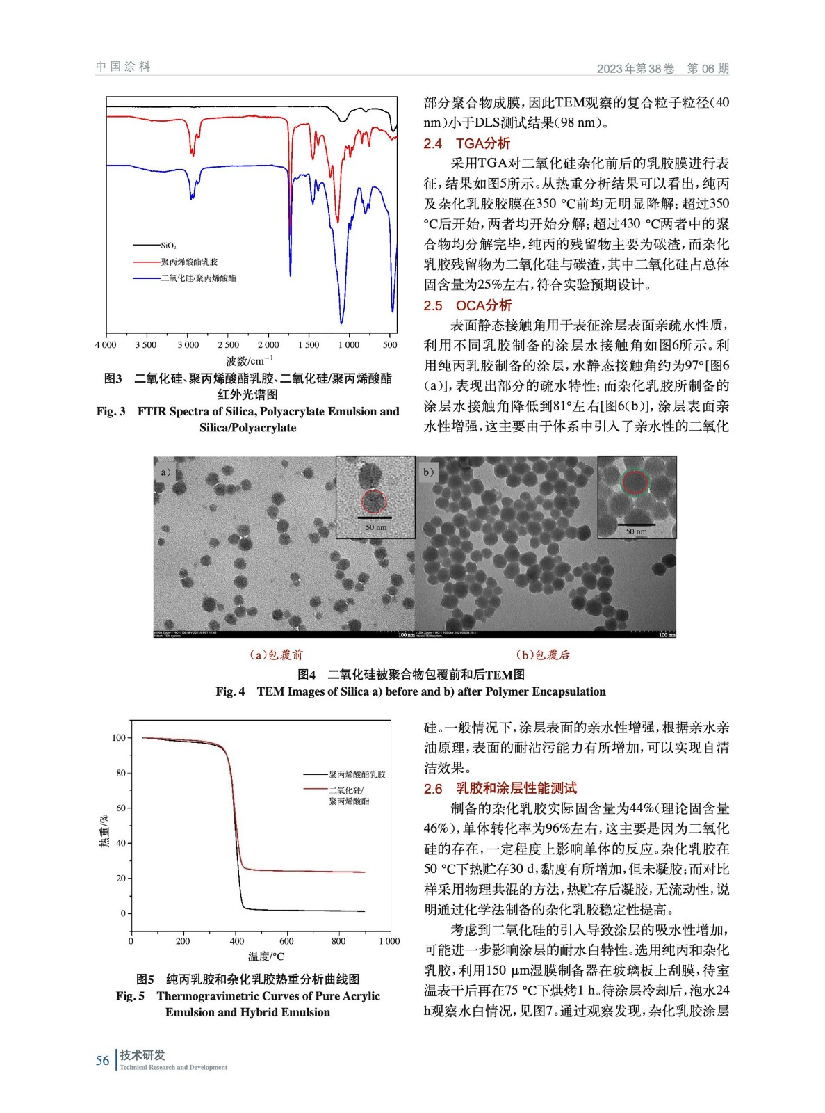 摘要:以二氧化硅為無機組分,甲基丙烯酸甲酯、丙烯酸丁酯、丙烯酸異辛酯為主單體,選擇合適的聚合工藝和配方,通過種子乳液半連續法合成二氧化硅/聚丙烯酸酯雜化乳膠,并應用于外墻涂料中,考察其基礎性能。通過傅里葉紅外光譜儀(FTIR)及透射電子顯微鏡(TEM)分析表明二氧化硅成功與聚丙烯酸酯復合,形成以二氧化硅為核,聚丙烯酸酯為殼的雜化乳膠。制備的雜化乳膠與純聚丙烯酸酯乳膠同時應用于外墻涂料中,通過接觸角測試(OCA)分析表明:雜化乳膠制備的涂層親水性更強,水接觸角為82°,純丙配方水接觸角為97°;參照外墻涂料標準GB/T 9755—2014,雜化乳膠制備的涂料耐沾污性為7%,相比純丙乳膠的14%有極大的提升,同時涂料的其他性能,如耐水性、耐堿性、耐洗刷性等均未出現異常劣化。