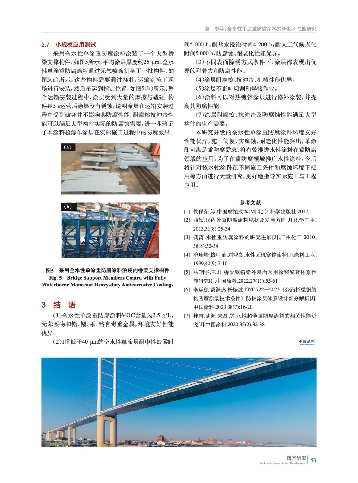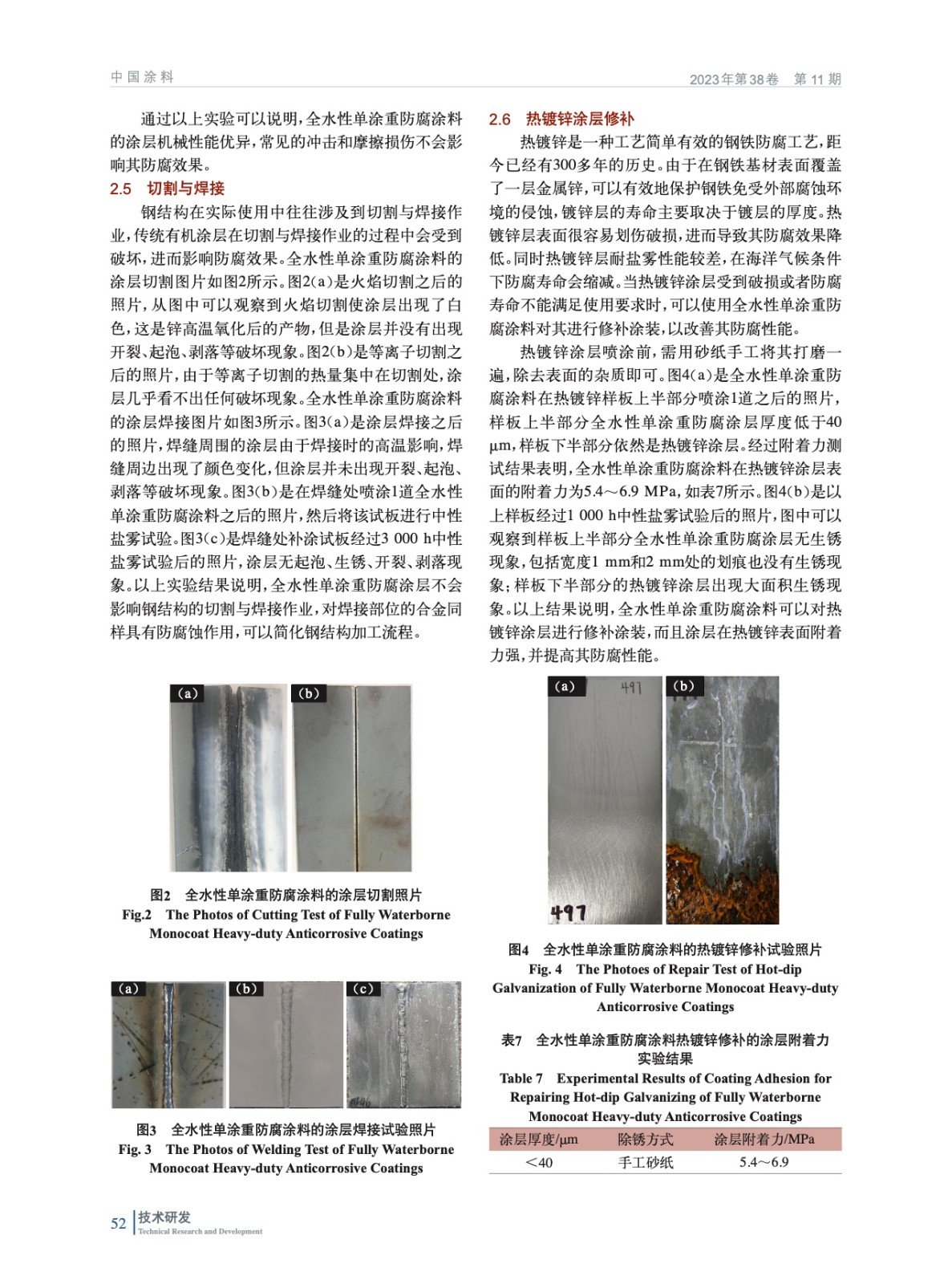 摘要:研究開發了一種全水性單涂重防腐涂料,其VOC含量為3.5 g/L,無苯系物和鉛、鎘、汞、鉻有毒重金屬;1道低于40 μm的單涂層耐中性鹽霧時間5 000 h,耐鹽水浸泡時間4 200 h,耐人工氣候老化時間4 200 h;不同表面除銹方式條件下,涂層都表現出優異的附著力和防腐性能;涂層耐摩擦、抗沖擊、機械性能優異;涂層不影響切割和焊接作業;涂料可以對熱鍍鋅涂層進行修補涂裝,并提高其防腐性能;制作的大型橋梁支撐構件,使用3 a涂層無生銹現象。