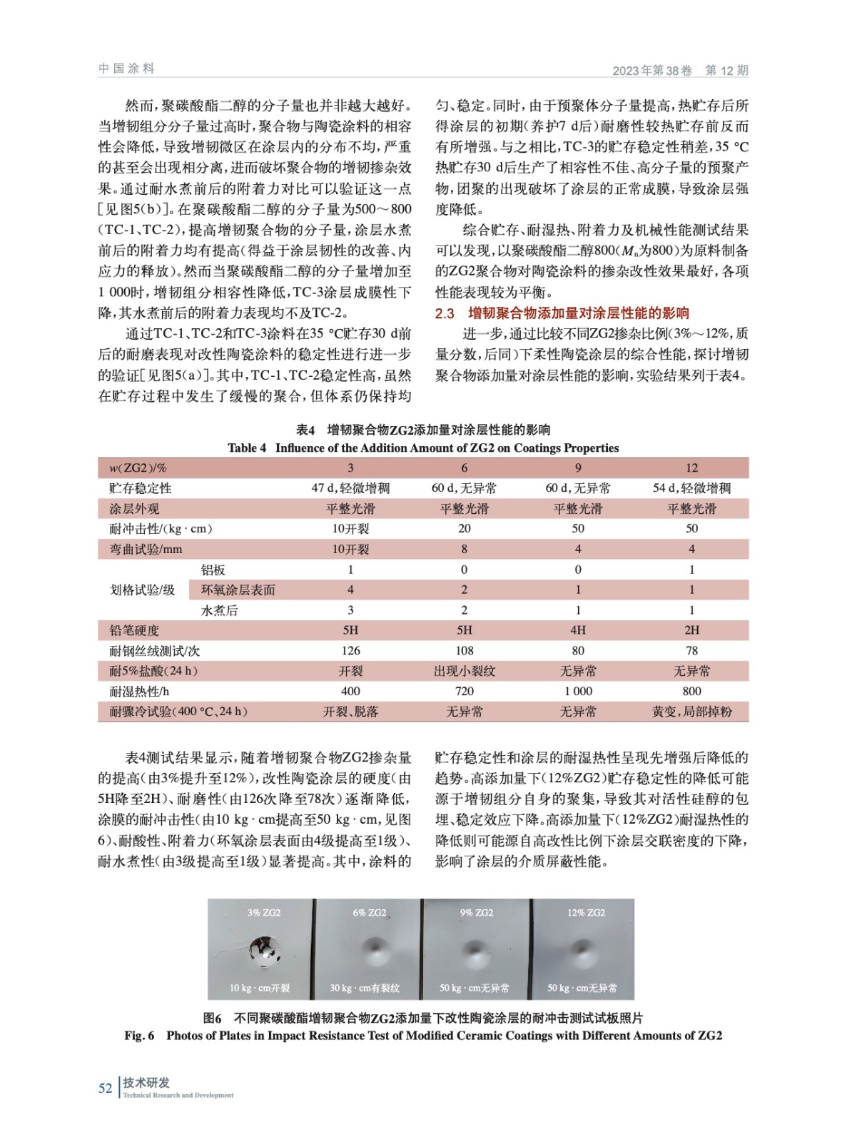 摘要:以聚碳酸酯二醇和γ–異氰酸酯基丙基三乙氧基硅烷為原料,制備了具有良好硅烷相容性與貯存穩定性的活性增韌聚合物ZG2,并將其應用于陶瓷涂料的柔性改性。實驗結果顯示,聚碳酸酯基增韌聚合物ZG2的摻雜,一方面可以包埋涂料中的活性硅醇,延長涂料的貯存周期;另一方面可以充當涂層中的柔性緩沖區,改善因收縮應力而產生的涂層開裂、附著力低等問題。此外,ZG2還可以參與陶瓷涂料的交聯進程,提升涂層的腐蝕介質屏蔽性。當ZG2的摻雜質量分數為9%時,所得改性雜化陶瓷涂料的貯存穩定性、熱穩定性、機械強度及綜合防護性能最優,具備市場化推廣潛力。