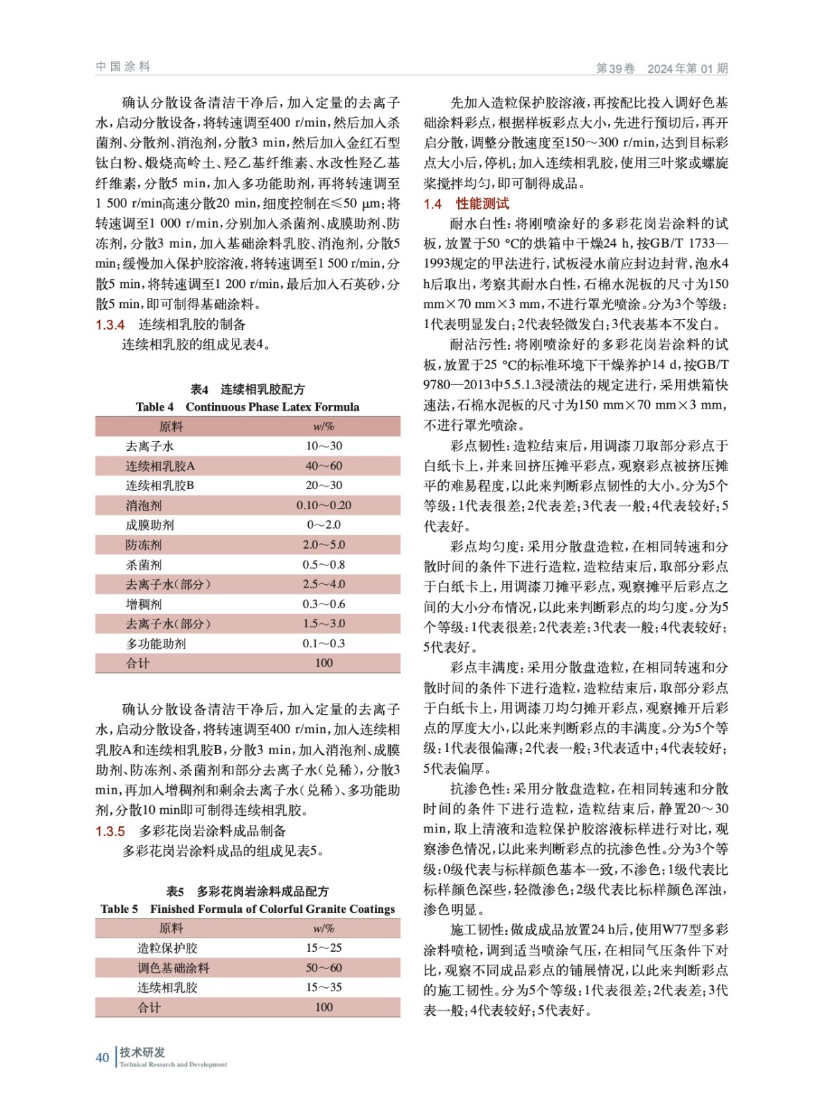 摘要:系統(tǒng)地研究了不同保護(hù)膠、纖維素和乳膠的種類、用量對水包砂多彩花崗巖涂料的彩點(diǎn)、穩(wěn)定性、耐水白性、耐沾污性和耐人工老化性的影響。結(jié)果表明:當(dāng)造粒保護(hù)膠Hatorite S482溶液濃度在4.0%~6.0%,纖維素醚250HHBR用量在0.5%(質(zhì)量分?jǐn)?shù),后同)、HE10K用量在0.1%,基礎(chǔ)涂料乳膠選用AP-4765,添加量在14%~18%,連續(xù)相乳膠選擇8087與RS-3765進(jìn)行復(fù)配,總量控制在70%~80%,其制得的水包砂多彩花崗巖涂料,彩點(diǎn)不僅具有優(yōu)異的韌性、均勻度、豐滿度、抗?jié)B色性,而且具有優(yōu)異的貯存穩(wěn)定性、耐水白、耐沾污性和耐人工老化性。