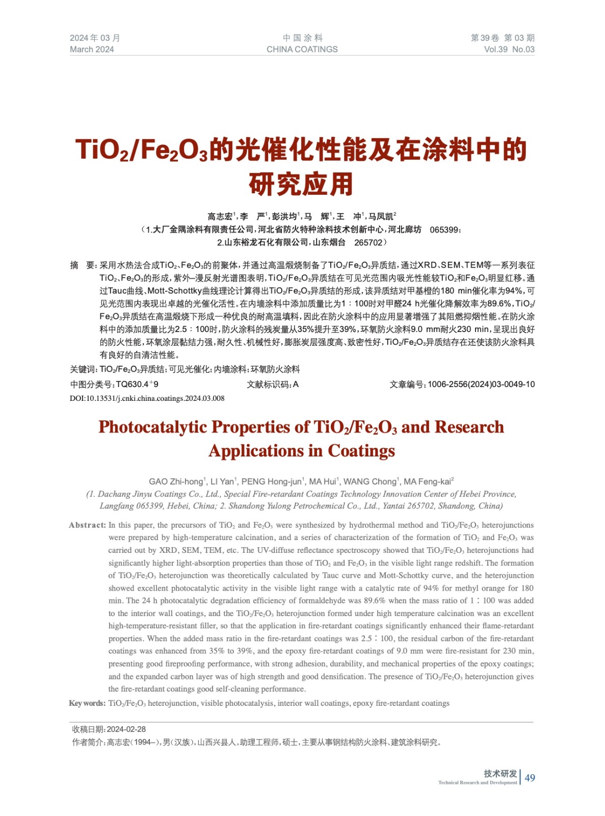 TiO2/Fe2O3的光催化性能及在涂料中的研究應(yīng)用