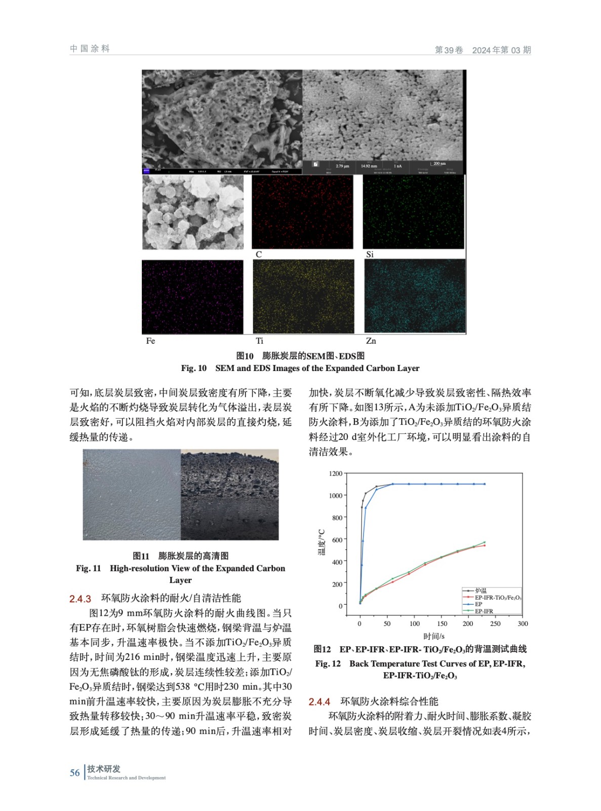 摘要:采用水熱法合成TiO2、Fe2O3的前聚體,并通過高溫煅燒制備了TiO2/Fe2O3異質(zhì)結(jié),通過XRD、SEM、TEM等一系列表征TiO2、Fe2O3的形成,紫外–漫反射光譜圖表明,TiO2/Fe2O3異質(zhì)結(jié)在可見光范圍內(nèi)吸光性能較TiO2和Fe2O3明顯紅移。通過Tauc曲線、Mott-Schottky曲線理論計(jì)算得出TiO2/Fe2O3異質(zhì)結(jié)的形成,該異質(zhì)結(jié)對(duì)甲基橙的180 min催化率為94%,可見光范圍內(nèi)表現(xiàn)出卓越的光催化活性。在內(nèi)墻涂料中添加質(zhì)量比為1∶100時(shí)對(duì)甲醛24 h 光催化降解效率為89.6%,TiO2/Fe2O3異質(zhì)結(jié)在高溫煅燒下形成一種優(yōu)良的耐高溫填料,因此在防火涂料中的應(yīng)用顯著增強(qiáng)了其阻燃抑煙性能。在防火涂料中的添加質(zhì)量比為2.5∶100時(shí),防火涂料的殘?zhí)苛繌?5%提升至39%,環(huán)氧防火涂料9.0 mm耐火230 min,呈現(xiàn)出良好的防火性能,環(huán)氧涂層黏結(jié)力強(qiáng),耐久性、機(jī)械性好,膨脹炭層強(qiáng)度高、致密性好,TiO2/Fe2O3異質(zhì)結(jié)存在還使該防火涂料具有良好的自清潔性能。