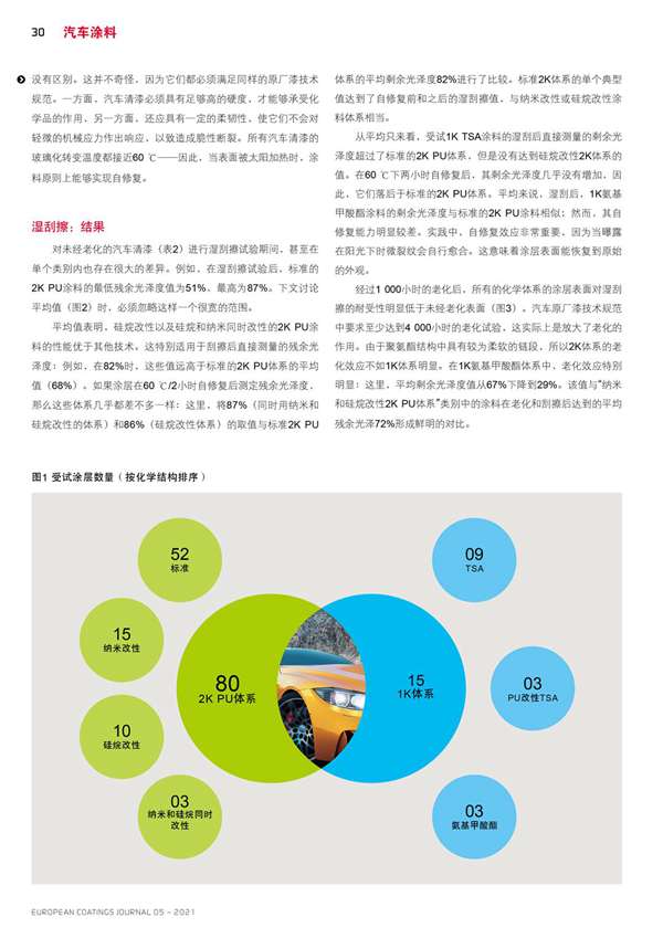對95種汽車清漆體系進行了干/濕刮擦試驗(老化前后)和耐化學品試驗。該基準研究的試驗揭示了各體系之間存在巨大的差異。