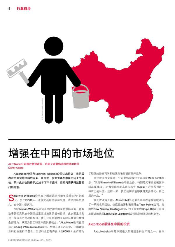 摘要:AkzoNobel公司通過(guò)補(bǔ)強(qiáng)收購(gòu),鞏固了在裝飾涂料領(lǐng)域的地位