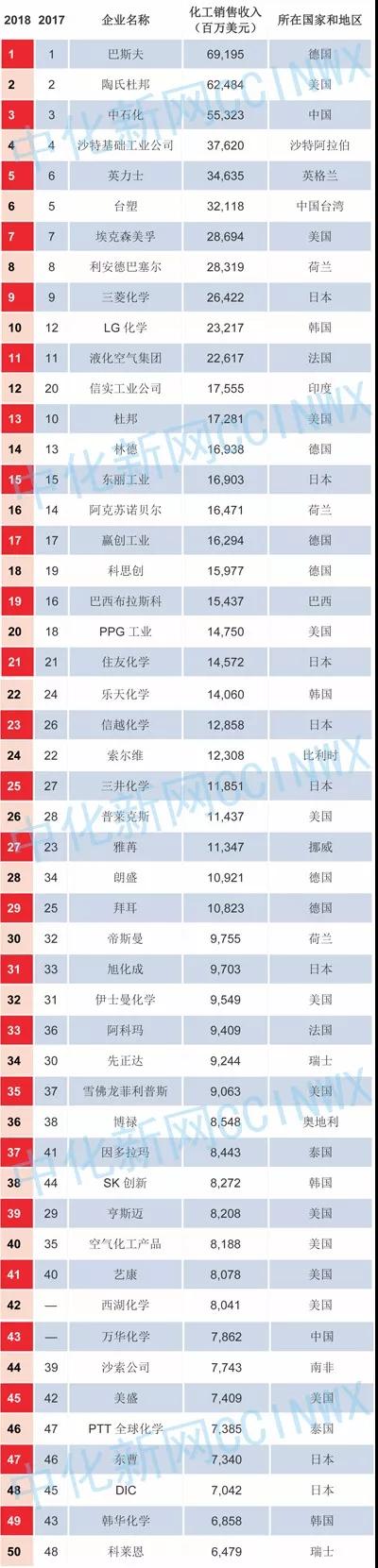 今年加上被中國化工集團(tuán)收購的先正達(dá),中國化工企業(yè)有4家公司進(jìn)入50強(qiáng)。分別是中國石化排第3、臺(tái)塑排第6、先正達(dá)第34位、萬華化學(xué)位列第43。2017年中國僅有兩家企業(yè)入圍,分別是中國石化和臺(tái)塑。