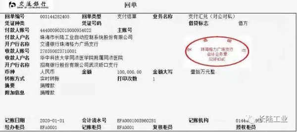 武漢疫情的發展也牽動著長陸人的心,今天,珠海市長陸工業自動控制系統股份有限公司(簡稱長陸工控)向武漢市華中科技大學同濟醫學院附屬同濟醫院捐贈人民幣10萬元,用于開展抗擊新型冠狀病毒感染的肺炎疫情之需,長陸公司希望以此為抗擊疫情盡一份綿薄之力。