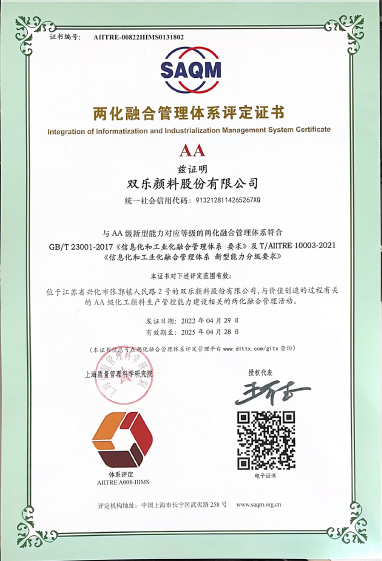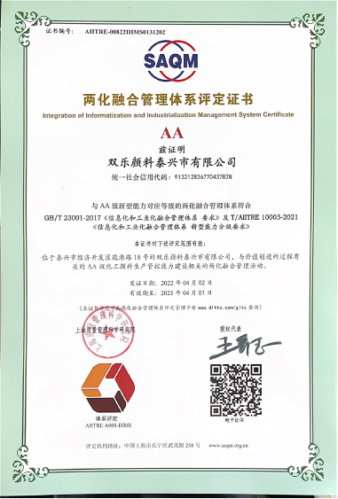近日,雙樂顏料股份有限公司、雙樂顏料泰興市有限公司榮獲兩化融合管理體系評定證書,是興化市、泰興市第一批兩化融合管理體系2.0版貫標并獲得AA認定的企業。