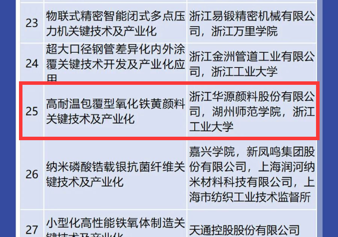 “高耐溫包覆型氧化鐵黃顏料關鍵技術及產業化”項目是華源顏料聯合湖州師范學院與浙江工業大學,采用產學研技術開發,解決了氧化鐵黃顏料耐熱性差的關鍵技術問題,首次提出采用磷酸鹽緩釋-包覆方法,提高了氧化鐵黃顏料的耐熱性能,實現了耐高溫氧化鐵黃顏料的國產化,打破國外公司對高耐溫包覆型氧化鐵黃產品的壟斷。