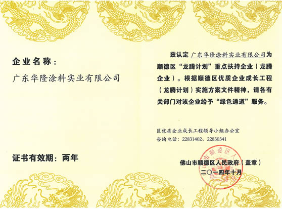2014年10月,廣東省佛山市順德區(qū)人民政府發(fā)布《關(guān)于新一批龍騰企業(yè)的公示通告》,公布了通過復(fù)評(píng)和補(bǔ)增入選“龍騰企業(yè)”共300家企業(yè)名單。廣東華隆涂料實(shí)業(yè)有限公司,連續(xù)三次入選“龍騰企業(yè)”。
