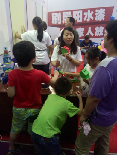 晨陽(yáng)水漆展區(qū)重點(diǎn)展示了公司生產(chǎn)的環(huán)保型家裝水漆和多功能水漆。為了讓參觀者更好地了解環(huán)保水漆特性和應(yīng)用,公司展位精心設(shè)計(jì)了海報(bào)、宣傳單頁(yè);布置有水漆應(yīng)用在工業(yè)、家裝、木器領(lǐng)域的展板和模型;邀請(qǐng)參觀人員現(xiàn)場(chǎng)用水漆涂刷木房子,親身體驗(yàn)晨陽(yáng)水漆的環(huán)保特性,現(xiàn)場(chǎng)更有訂單抽獎(jiǎng)100%中獎(jiǎng)活動(dòng)等給廣大老百姓帶來(lái)實(shí)惠的環(huán)節(jié),成為了展會(huì)關(guān)注焦點(diǎn),參觀者絡(luò)繹不絕。