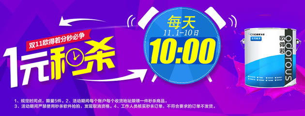 除此之外,活動期間晨陽水漆還有“全場無門檻禮券免費(fèi)送”、“特權(quán)定金,10元抵100元”、“轉(zhuǎn)盤抽獎”等活動。11月1-10日,更有每天上午10時(shí)整的“1元秒殺”活動,每天10時(shí)、14時(shí)、20時(shí)三個(gè)整點(diǎn)開搶“10元搶300元免單券”等系列活動,先到先得,搶完即止。