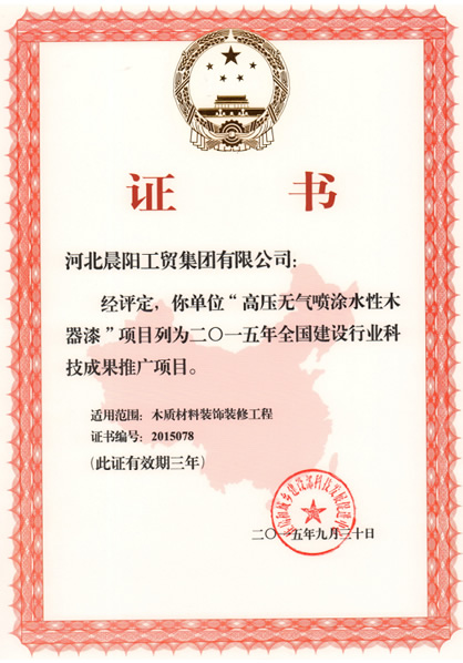 近日,由晨陽水漆研發生產的“高壓無氣噴涂水性木器漆”被列入2015年全國建設行業科技成果推廣項目。截至目前,該公司已有3項科技成果榮獲“全國建設行業科技成果推廣項目”證書。