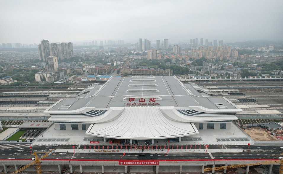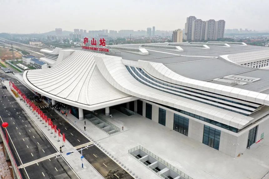 2022年4月底,九江市首座高鐵站——廬山站西站房正式開通運營。站臺設計融入廬山云霧和山水的柔美形態,色彩明快,意境唯美,與遠處的自然景觀遙相呼應,于山影水語間大放異彩!