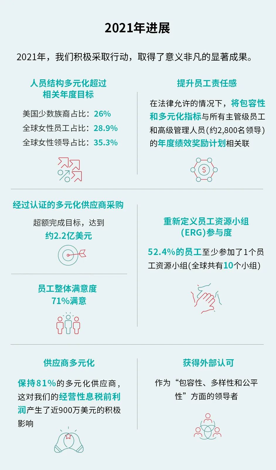 在美國少數(shù)族裔(26%)、全球女性員工(28.9%)、全球女性領(lǐng)導(dǎo)(35.3%)的占比方面均超過相關(guān)的年度提升目標(biāo)。