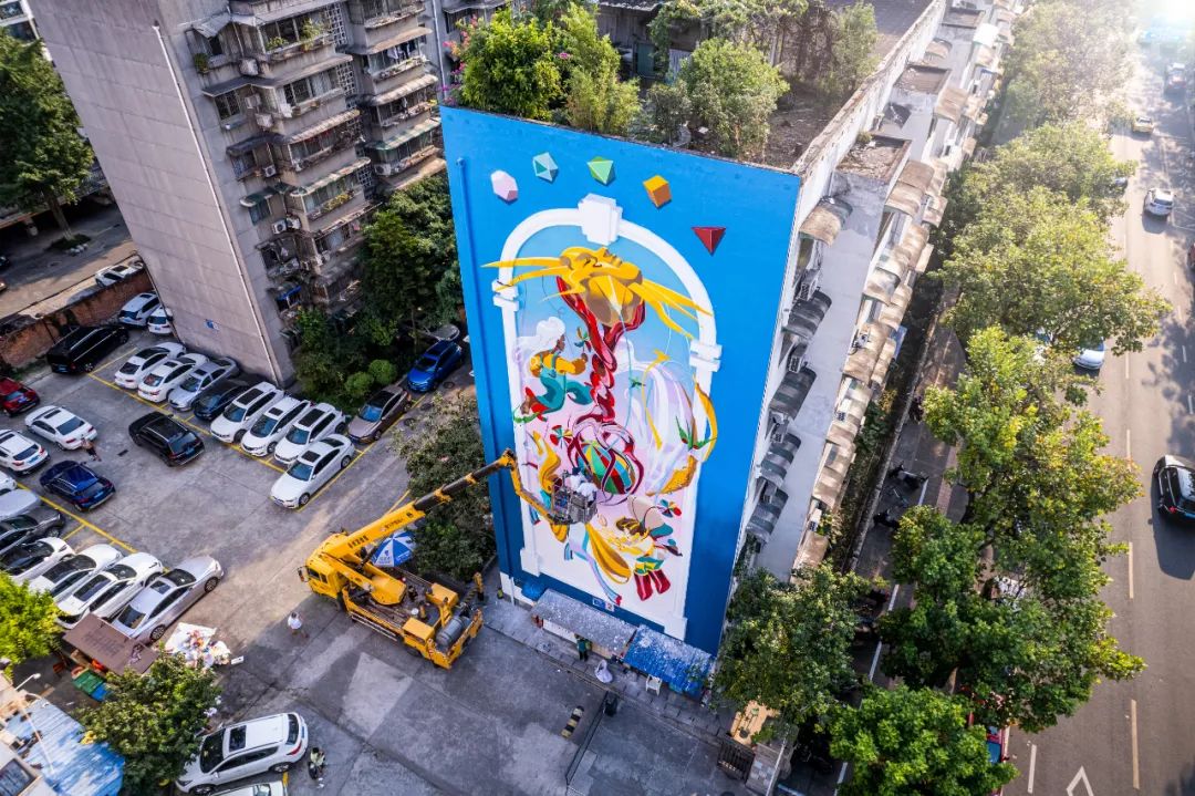 《宇宙八音盒》的作品理念源自Sheep對生命獻上的至美贊歌。從2018年參與“為愛上色”項目以來,這已經是他創作的第八幅Art+墻繪作品。此次,他以嬰兒轉鈴為創作靈感,描繪了男孩、女孩、鯨魚、燕子和獨角獸等生動形象,講述著著地球上的萬物生靈,在愛的普照下彼此聯結,圍繞“生命之樹”歡快起舞的美好畫面,寓意人、動物與自然之間的和諧共生。墻繪創作期間的高溫天氣不僅沒有影響Sheep的創作激情,更引得熱情的成都市民駐足停留。