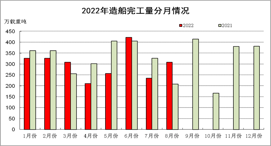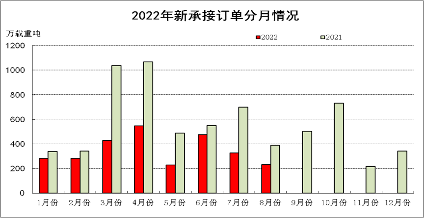 1~8月,50家重點監測的造船企業完工出口船2071萬載重噸,同比下降15.9%;承接出口船訂單2494萬載重噸,同比下降42.9%;8月末手持出口船訂單9001萬載重噸,同比增長12.2%。出口船舶分別占重點造船企業完工量、新接訂單量、手持訂單量的90.4%、94.8%和91.1%。