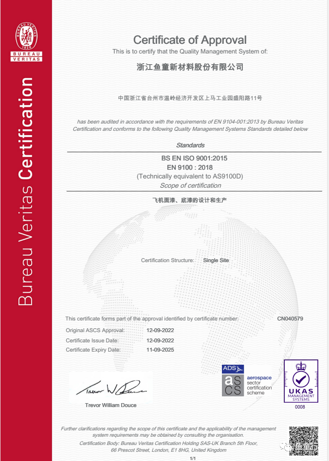 2022年9月,魚童取得了法國BV公司的AS 9100D航空航天裝備質(zhì)量管理體系認(rèn)證證書,標(biāo)志著魚童正式進(jìn)入航空涂料賽道并獲得了國際公司的認(rèn)可。該標(biāo)準(zhǔn)是在ISO 9001質(zhì)量體系要求基礎(chǔ)上開發(fā)的航空航天裝備質(zhì)量管理標(biāo)準(zhǔn),其評價內(nèi)容多、章節(jié)細(xì)分標(biāo)準(zhǔn)高、實施過程嚴(yán)格、難度大;該體系認(rèn)證得到了包括空客、波音、通用電氣等主要航空制造商的認(rèn)可、支持與廣泛應(yīng)用。
