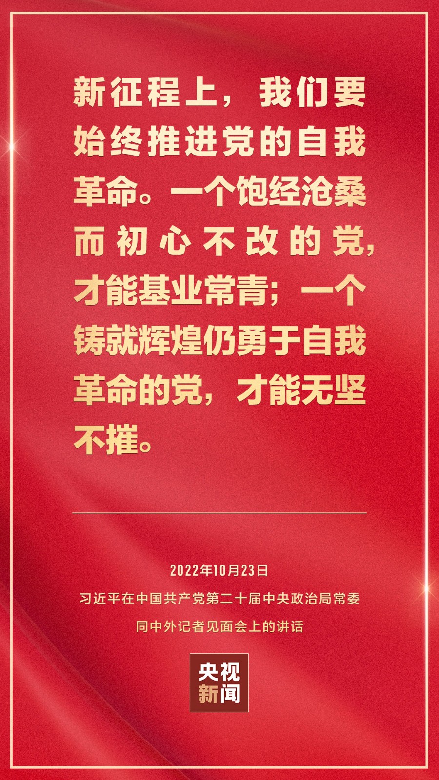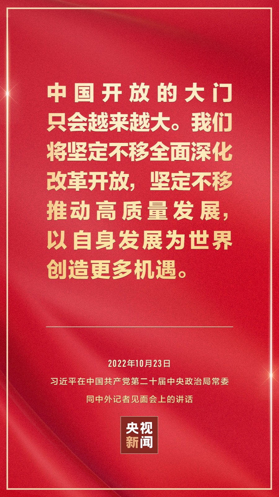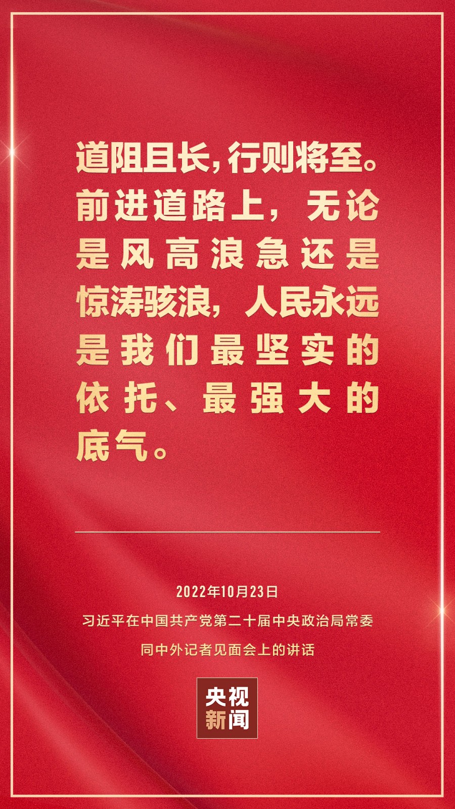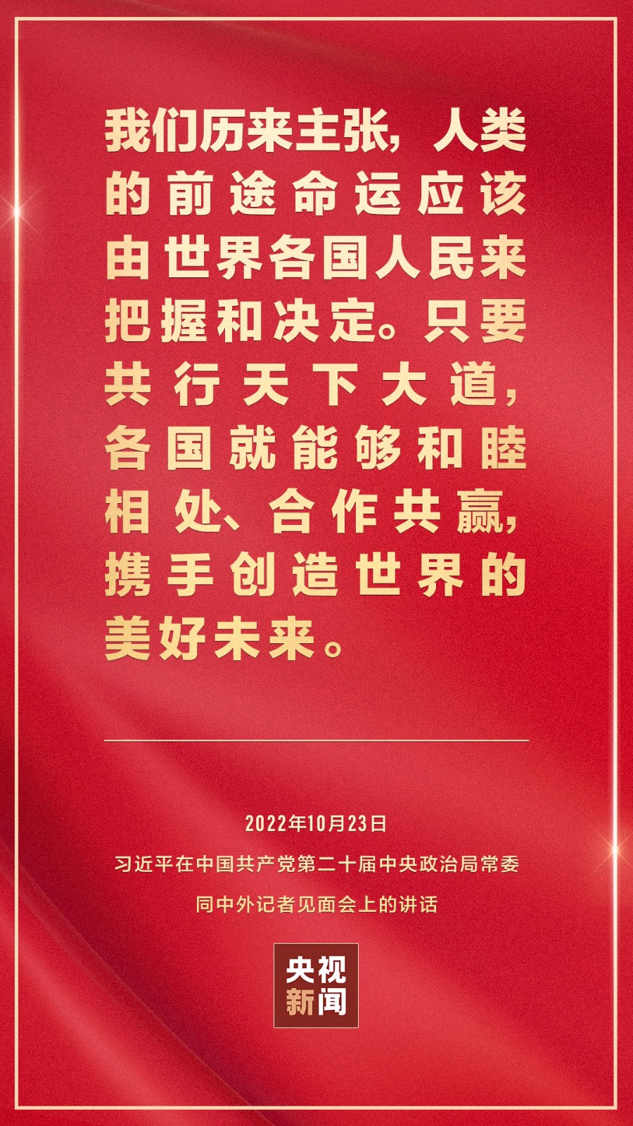 在中國共產黨第二十屆中央委員會第一次全體會議上當選的中共中央總書記習近平和中共中央政治局常委李強、趙樂際、王滬寧、蔡奇、丁薛祥、李希,23日中午在人民大會堂同采訪中共二十大的中外記者見面。習近平發表重要講話。