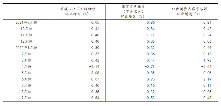 (2)根據季節調整模型自動修正結果,對近一年來各期國內生產總值、規模以上工業增加值、固定資產投資(不含農戶)、社會消費品零售總額環比增速進行修訂。修訂結果及2022年三季度GDP環比數據、2022年9月份其他指標環比數據如下: