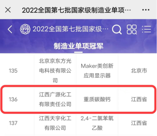 近日,工業和信息化部辦公廳、中國工業聯合會發布了“2022年第七批國家級制造業單項冠軍企業(產品)名單”,江西廣源化工有限責任公司成功入圍全國制造業“單項冠軍示范企業”公示名單。