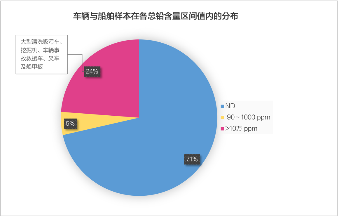 我國規定車輛及船舶色漆的總鉛含量要低于1000 ppm,如下圖所示,在此次調查的車輛及船舶類的21個樣本中,有15個樣本低于該限定值(約占該場景樣本總數的71%),其中有15個樣本未檢測出重金屬鉛,然而有5個樣本的總鉛含量高于10萬ppm。高于10萬ppm 的樣本分別為大型清洗吸污車、挖掘機、車輛事故救援車、叉車及船甲板。