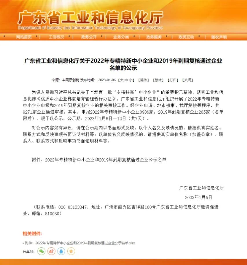 近日,廣東省工信廳組織開展了2022年度省級專精特新中小企業申報認定工作并對審核通過的企業予以公示,標格達精密儀器(廣州)有限公司成功入選“專精特新”中小企業名單!