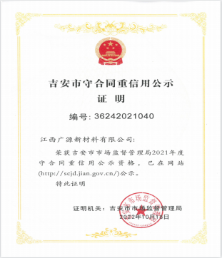 近期,江西廣源新材料公司再添榮譽,榮獲吉安市2021年度“守合同重信用”公示證明。